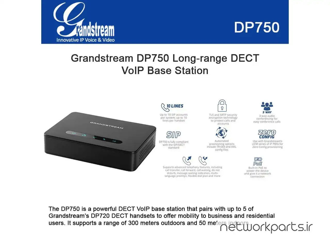 ویژگی ها3-way voice conferencing, full HD audio, integrated PoE, Automated provisioning options include TR-069 and XML config files, Offers multiple ring group options, including Circular, Linear, Parallel and Shared modes, Supports a range of up to 300 meters outdoors and 50 meters indoors, TLS and SRTP security encryption, Up to 10 SIP accounts per system; up to 10 lines per handset; up to 5 concurrent calls per DECT system, Use with Grandstream’s UCM series of IP PBXs for Zero Config provisioning