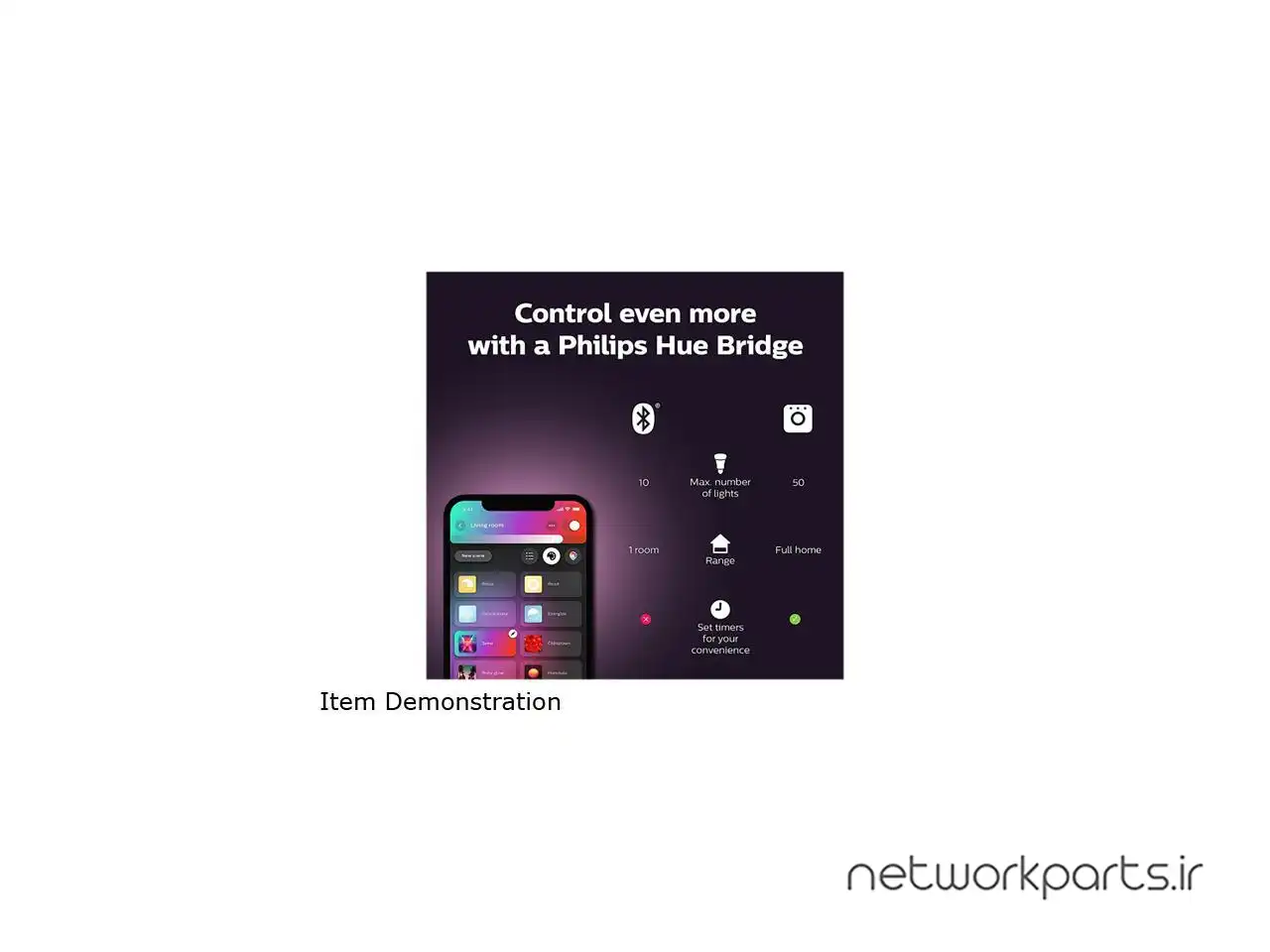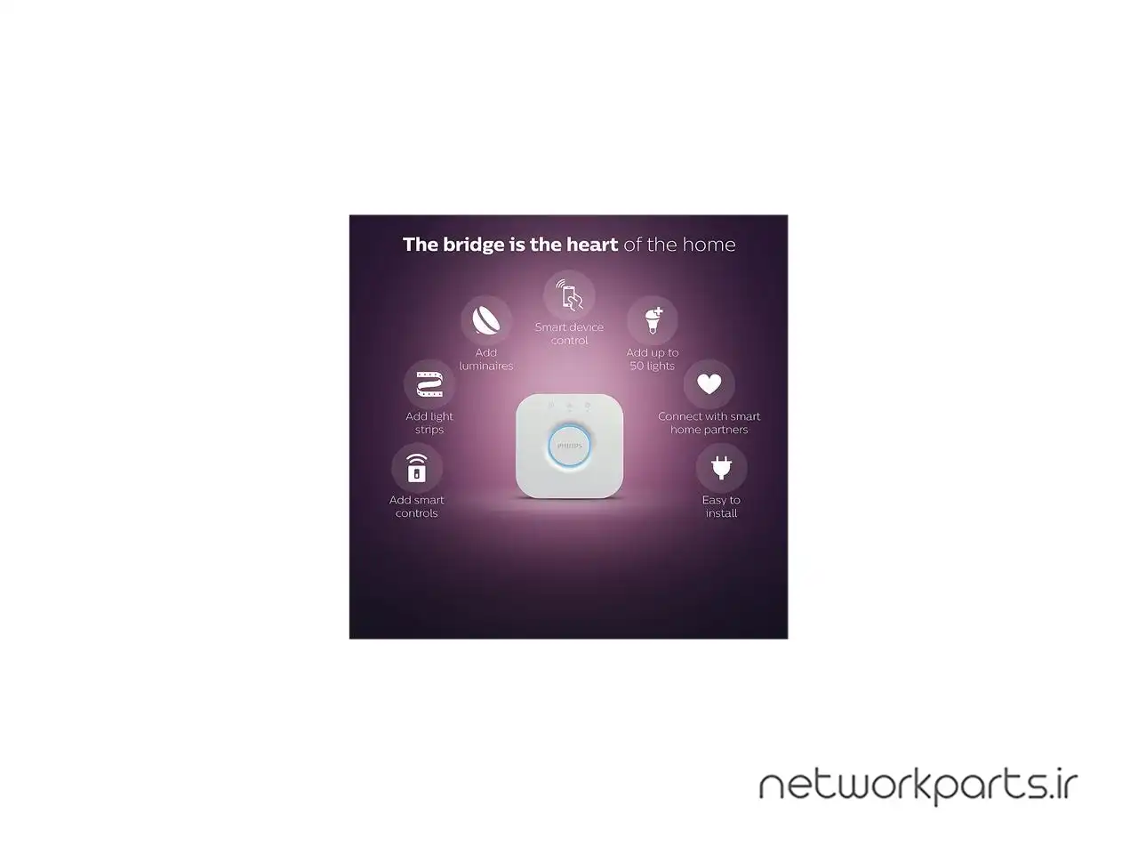 ویژگی ها | CONTROL YOUR SMART LIGHTS FROM ANYWHERE: The heart of your Philips Hue system, this hue hub also enables you to control all of your Philips Hue products via the Philips Hue app, even when you&apos, CROSS-DEVICE COMPATIBILITY: HomeKit compatible iOS 9 or later. iPhone:4, 4S, 5, 5S, 6, 6 Plus, 7, iPhone 7 Plus, iPhone 8, iPhone 8 Plus, iPhone X, iPhone Xs, iPhone Xs Max, iPhone Xr, iPod touch: 5t, EXPAND YOUR ECOSYSTEM: Easily expand your smart lighting system with Philips Hue accessories (sold separately), such as a Hue Dimmer Switch, Hue Tap, or Hue Motion Sensor. Pair it for home automation, FULLY AUTOMATE YOUR SMART HOME: Enhance your Philips Hue system by setting timers and alarms, connecting to a variety of apps, dimming the smart lights and more (cannot be used with conventional dimm, VOICE ACTIVATED: With the Philips Hue Smart Hub, add up to 50 Philips Hue smart lights of your choice with this ZigBee-controlled hub necessary for voice control with Alexa, Apple HomeKit, or Google |