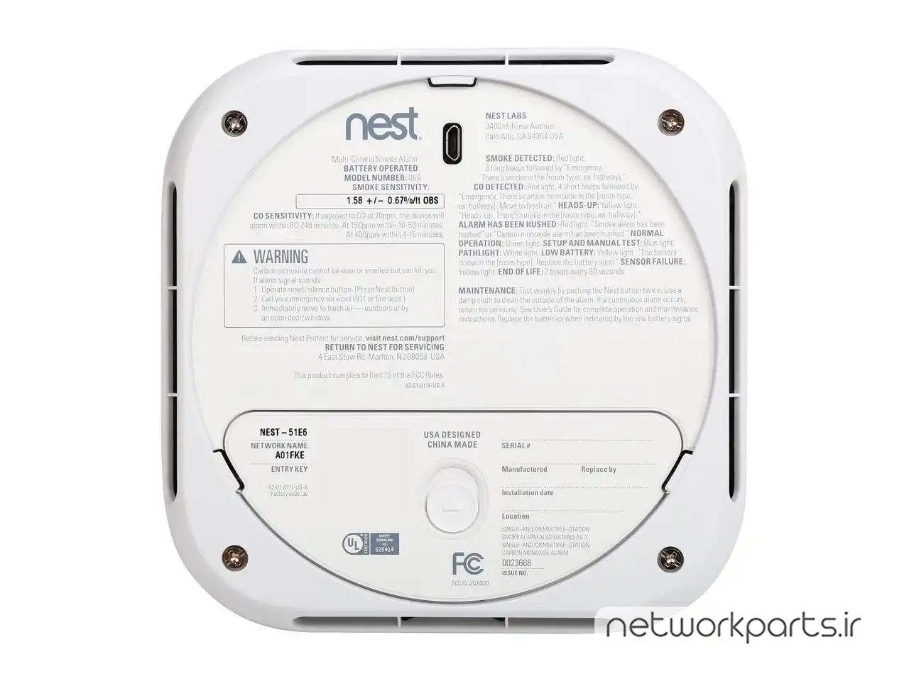 ویژگی ها | 10 year electrochemical carbon monoxide sensor, 2 Watt Speaker, Ambient light sensor, 1 - 100k Lux Dynamic Range, Bluetooth Low Energy (BLE), Canada: English, French (Québécois), Connectivity requirements:, France, Belgium and Netherlands: French and Dutch, Free Nest Account, Heat sensor, +/- 1 degrees Celsius (+/- 1.8 degrees Fahrenhit), Horn: 85 dB SPL at 3 m (10 feet), Humidity range: 20% RH to 80% RH (non condensing)., Humidity sensor, +/- 3%RH, Languages:, Note: After setup, you can change the language Nest Protect speaks to any of the above languages., Occupancy sensor, 120 degree field of view to 6 meters (20 feet), Omnidirectional microphone, 70 dBA SNR, Operating Temperature: -20 ~ 40 degree Celsius (-4 ~ 104 degree Fahrenheit), Phone or tablet with iOS 8 or later, or Android 4.1 or later, Power: Six long-life AA Energizer Ultimate Lithium batteries, Pre-installed languages by country, RGB color ring with 6 LEDs, Sensors, Speaker, horn, and light ring:, Split-Spectrum Sensor, 450 nm and 880 nm wavelength, The alarm should not be installed in locations where the normal ambient temperature is below 4 degrees Celsius (40 degrees Fahrenhit) or exceeds 38 degrees Celsius (100 degrees Fahrenhit)., United Kingdom: English (British), United States: English, Spanish, Wi-Fi connection, Wireless, Wireless Interconnect: 802.15.4 at 2.4 GHz, Working Wi-Fi connection: 802.11b/g/n at 2.4 GHz |