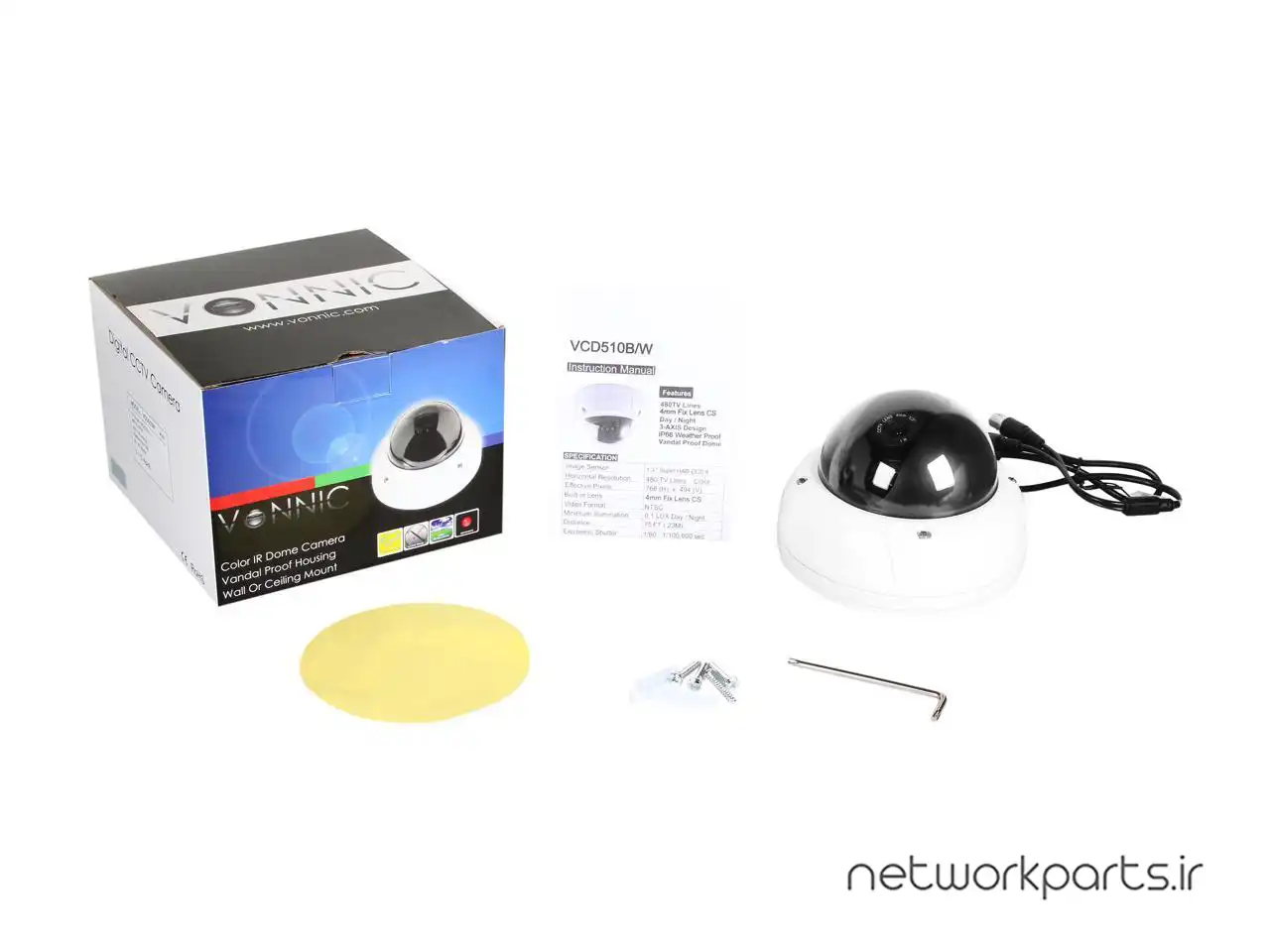 ویژگی ها | 3 AXIS design, Auto Gain Control: AUTO, Gamma Correction: 0.45, IP66 Weather/Vandal Proof, Minimum illumination: 0.1 LUX, Power Consumption: 500mA, Product Dimension (LxWxH): 5.3x5.3x4in (13.4x13.4x10.2cm), S/N Ratio: More than 48dB, Scanning system: NTSC, View Angle: 40 degree, White Balance: Auto |
