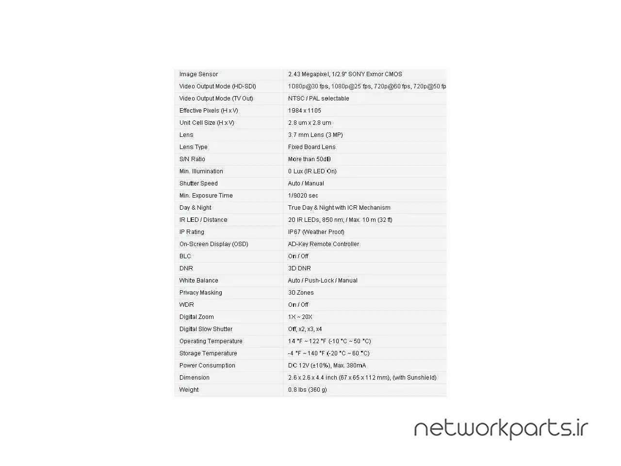 ویژگی ها | 1080p@30 fps, 1080p@25 fps / NTSC / PAL selectable, 2.43 Megapixel, 1/2.9? SONY Exmor CMOS, 3D DNR / BLC / WDR, DC 12V Power, f = 3.7 mm Lens (3 MP) / Fixed Board Lens, IP67 (Weather Proof), Min. Illumination of 0 Lux (IR LED On), OSD (On-Screen Display) AD-Key Remote Controller, True Day & Night with ICR Mechnism |