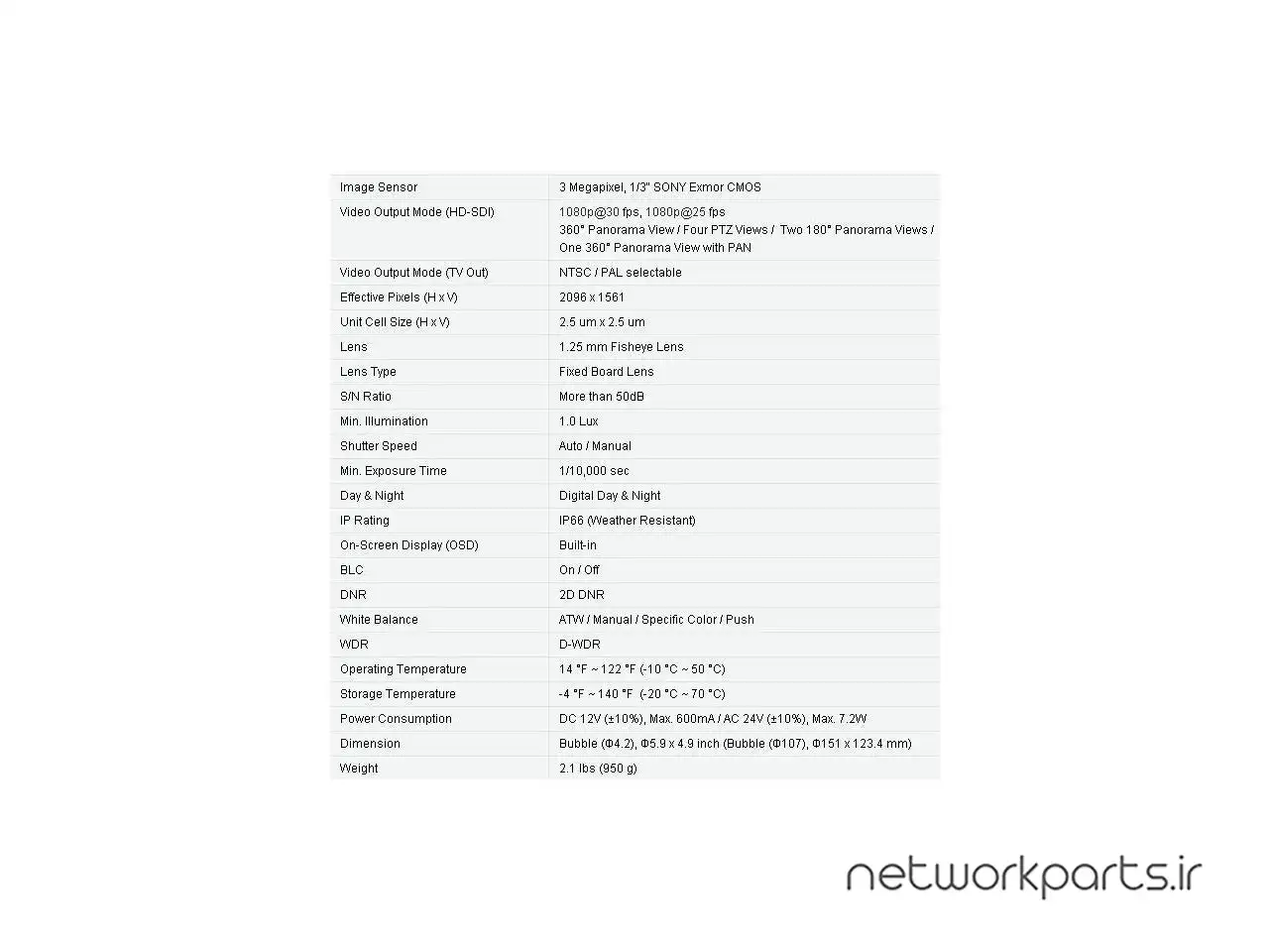 ویژگی ها | 1080p@30 fps, 1080p@25 fps / NTSC / PAL selectable, 2D DNR / BLC / WDR / OSD, 3 Megapixel, 1/2.8” SONY Exmor CMOS, 360° Panorama View / Four PTZ Views / One 360° Panorama View with PAN / Two 180° Panorama Views, DC 12V / AC 24V Dual Power, Digital Day & Night, f = 1.25 mm Fisheye Lens / Fixed Board Lens, IP66 (Weather Resistant), Min. Illumination of 1.0 Lux |