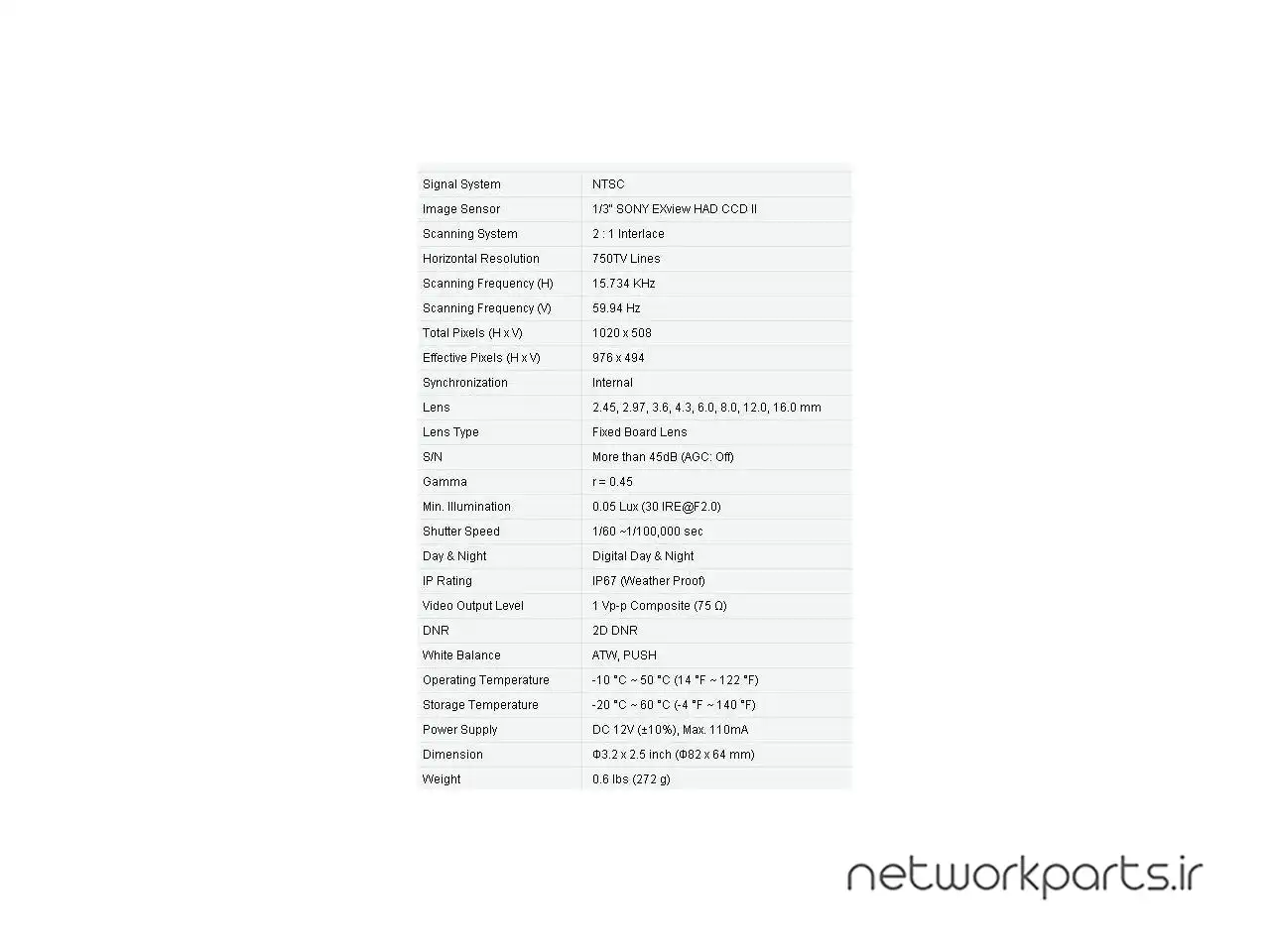 ویژگی ها | 1/3” SONY EXview HAD CCD II, 2D DNR, 3-Axis Gimbal Bracket, 750TVL Horizontal Resolution, DC 12V Power, Digital Day & Night, Extreme Operating temperature down to -40 degrees, f = 2.45, 2.97, 3.6, 4.3, 6.0, 8.0, 12.0, 16.0 mm, Fixed Board Lens, IP67 (Weather Proof), Min. Illumincation of 0.05 Lux |