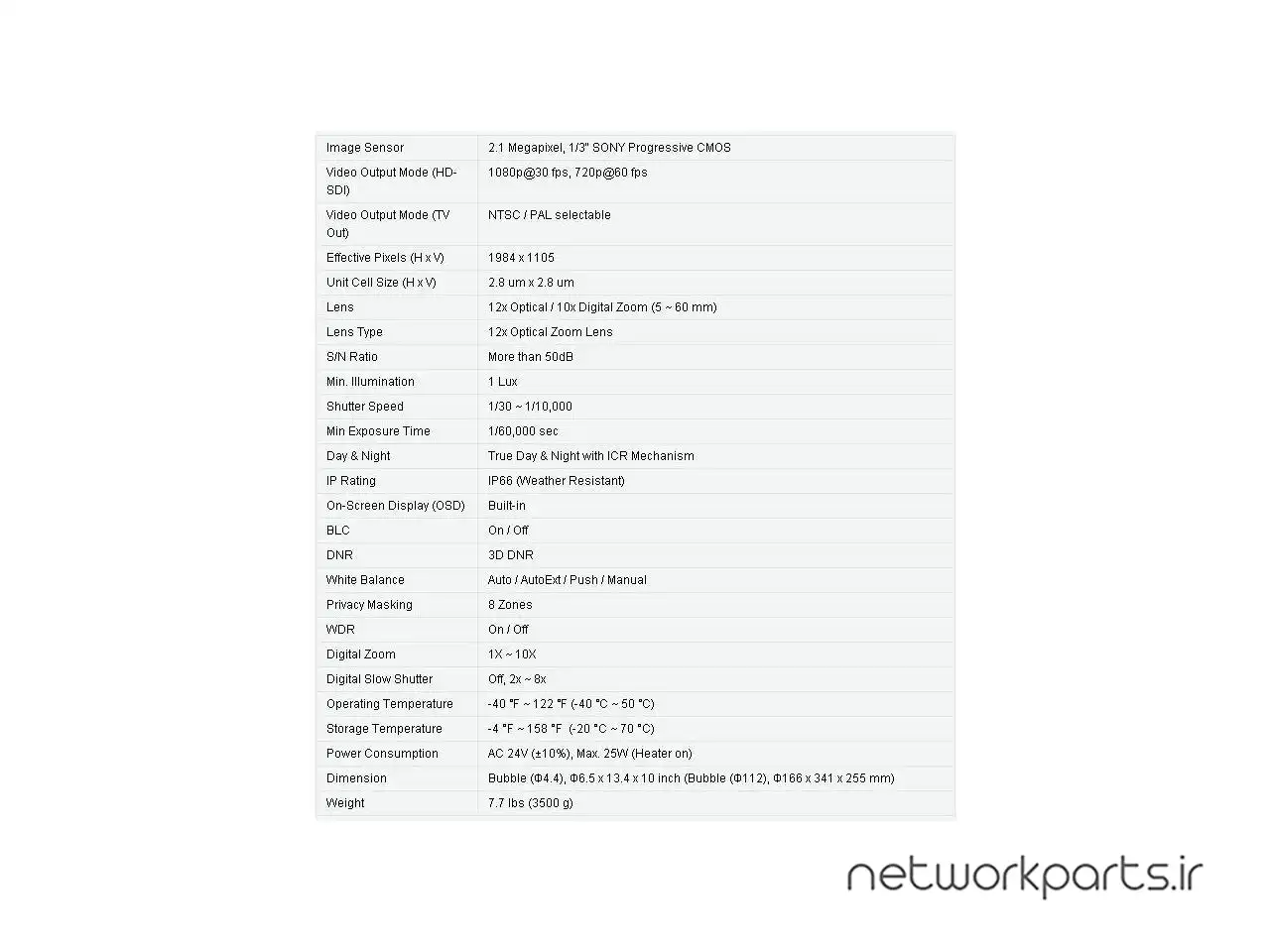 ویژگی ها | 12x Optical Zoom Lens, 2.1 Megapixel, 1/3? SONY Progressive CMOS, 210 Preset (except Short-cut command), 3D DNR / WDR / BLC / OSD, 8 Auto Scan / 8 Pattern / 8 Tours consist of Presets, AC 24 V Power, f = 12x Optical / 10x Digital Zoom (5 ~ 60 mm), HD-SDI (Serial Digital Interface Type Video Output), IP66 (Weather Resistant), Min. Illumination of 0.1 lux in b/w, 0.2 lux in color, Pan 360° Endless Rotation, Tilt 180° Vector scan, Standard protocols including Pelco-D/P, True Day & Night with ICR Mechnism |