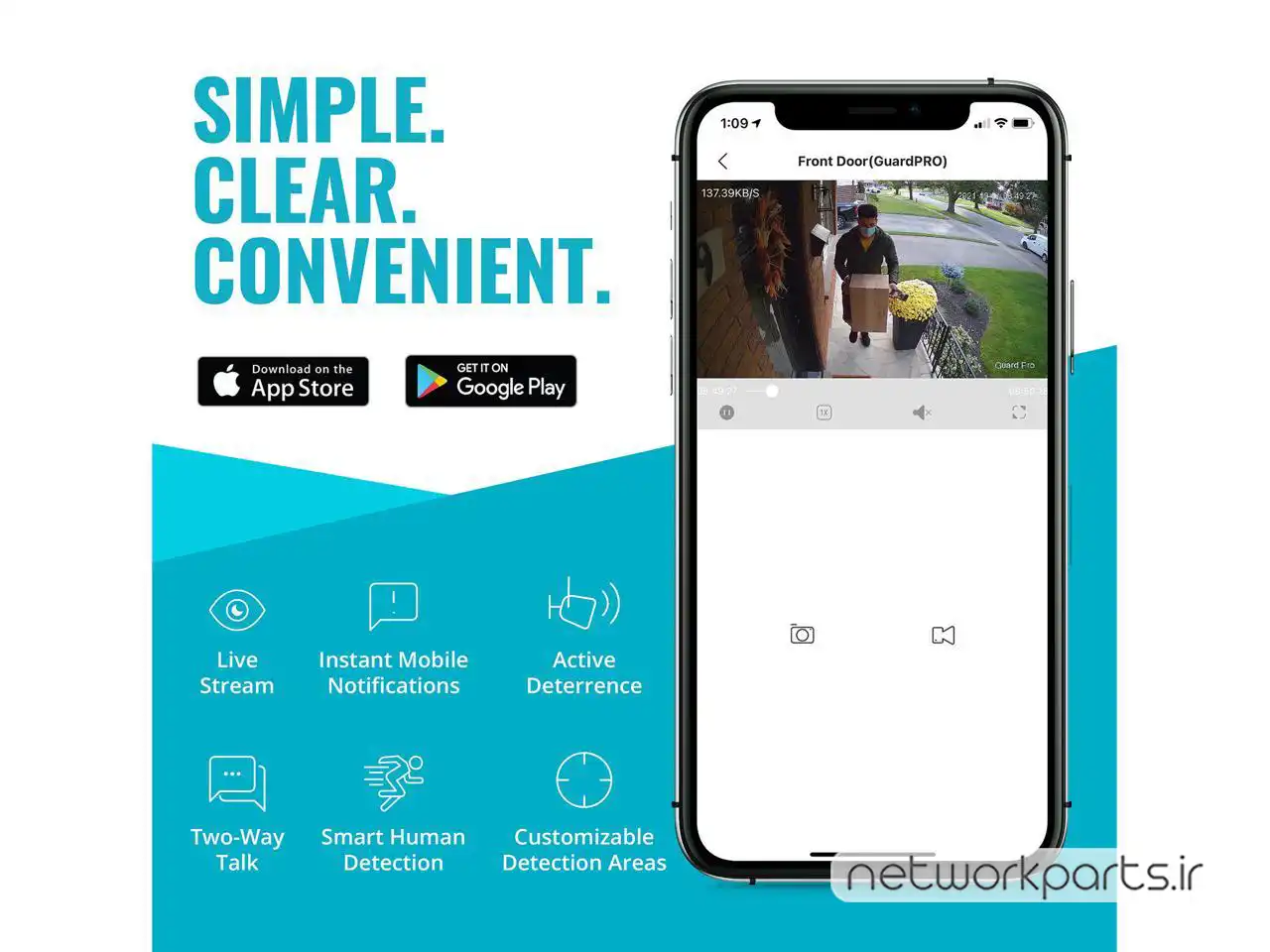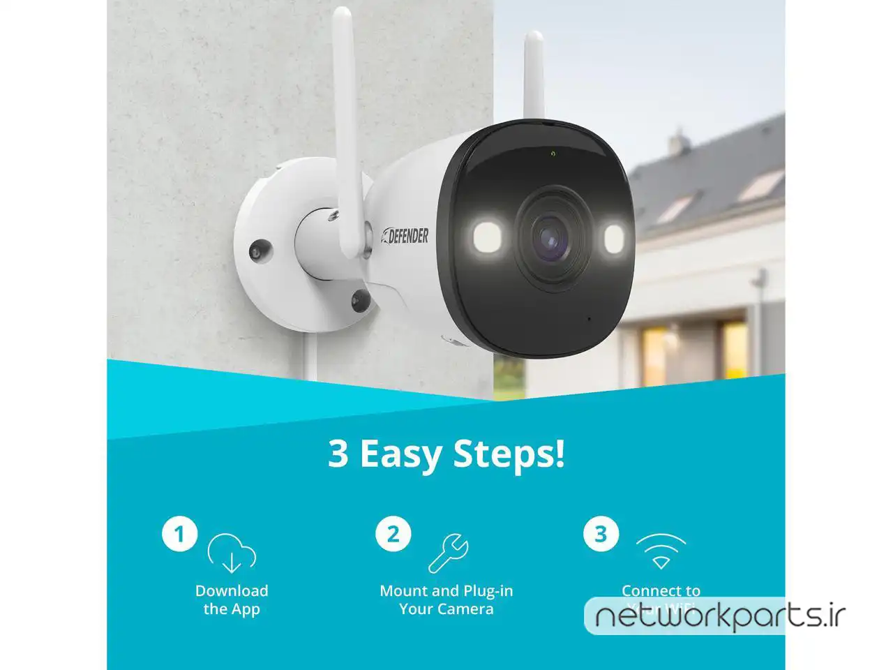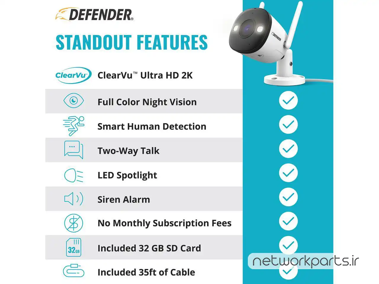 محتویات بسته بندی | Camera Power Supply (10 ft), Drilling Template, Ethernet Waterproof Cable Shield, Extension Cable (25 ft), Guard Pro Color Night Vision 2K WiFi Smart Outdoor Camera with pre-installed 32GB SD Card, Mounting Hardware Set, Quick Start Guide, Window Warning Sticker (3inx2in) |