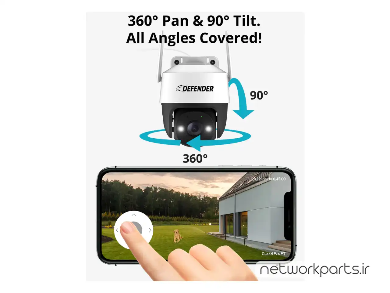 محتویات بسته بندی | 1xQuick Start Guide, 1xWarranty Registrations Insert, 2xCamera Power Supply (12V/1A 10 ft), 2xDefender Guard Pro PTZ Color Night Vision 4 MP Wi-Fi Pan-Tilt Smart Camera with pre-installed 32GB SD Card, 2xDrilling Template, 2xEthernet Waterproof Cable Shield, 2xExtension Cable (25 ft), 2xMounting Hardware Set, 2xVersatile Mounting Bracket, 2xWindow Warning Sticker (5”x3”), Lifetime Live Chat Support |