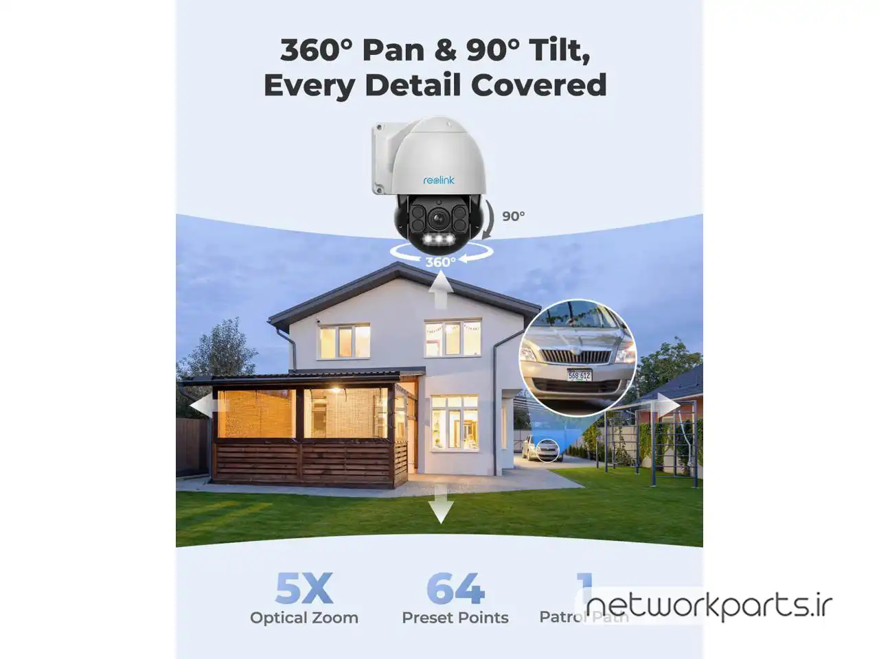 گردش افقی و عمودیPan: 360°, Tilt: 0° ~ 90°, 5X Optical Zoom