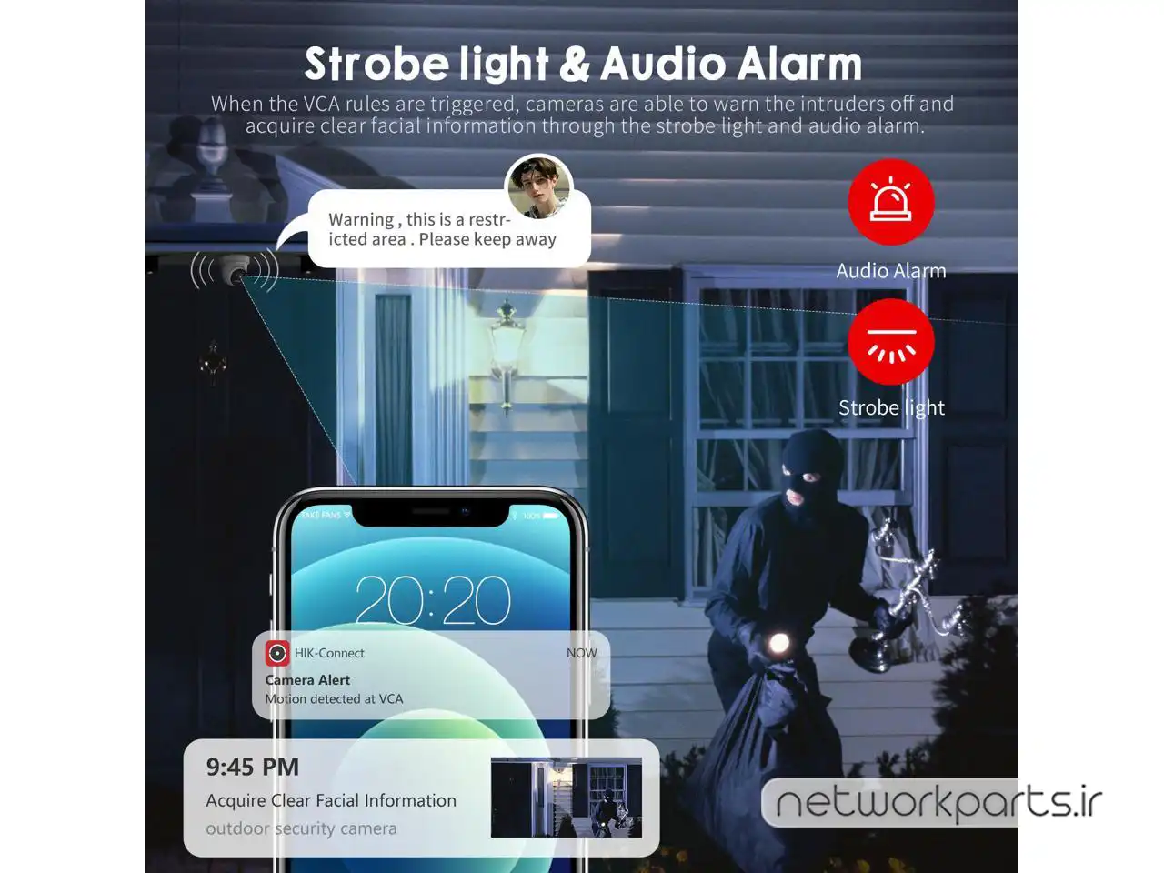 ویژگی ها | 24/7 colorful imaging, Active strobe light and audio alarm to warn intruders off, Audio and alarm interface available, Clear imaging against strong backlight with 120 dB true WDR technology, Efficient H.265+ compression technology, Focus on human and vehicle classification based on deep learning, High quality imaging with 8 MP resolution, Provide real-time security via built-in two-way audio, Water and dust resistant (IP67) and vandal-resistant (IK10) |