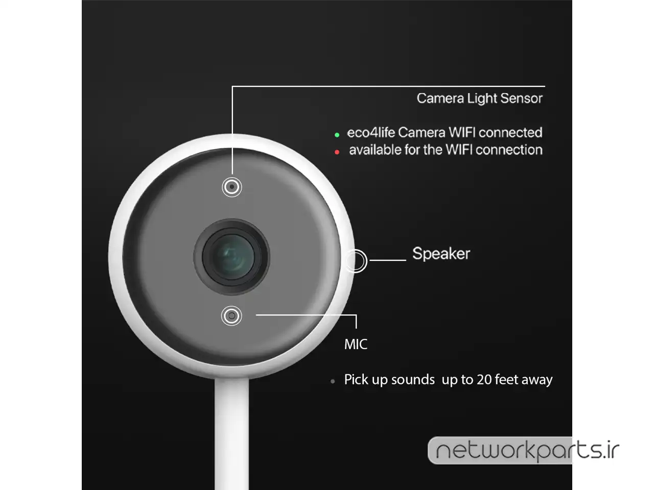 ویژگی ها | 2Mega pixel 1/3inch CMOS, 1920x1080 resolution, 2.5mm F2.0 LENS, 8-10m range night vision, H.264 video compression, two way audios, support local SD card storage max to 128GB., Cloud Storage is available with affordable monthly fee. The monthly/annual cloud storage service plan is optional., Easy setup. Plug in the eco4life smart camera and follow a few simple steps on the eco4life app to get your camera up and running. No hub or gateway required. Video recording. Motion events automatic, Instant alerts. Receive instant push notifications on your smart phone if anything moves. motion detect range support to 8-10 meters. eco4life provide 12 months warrantee, any defective issues free r, Motion tagging technology. Detects and outlines motion in both live stream and playback video modes. |