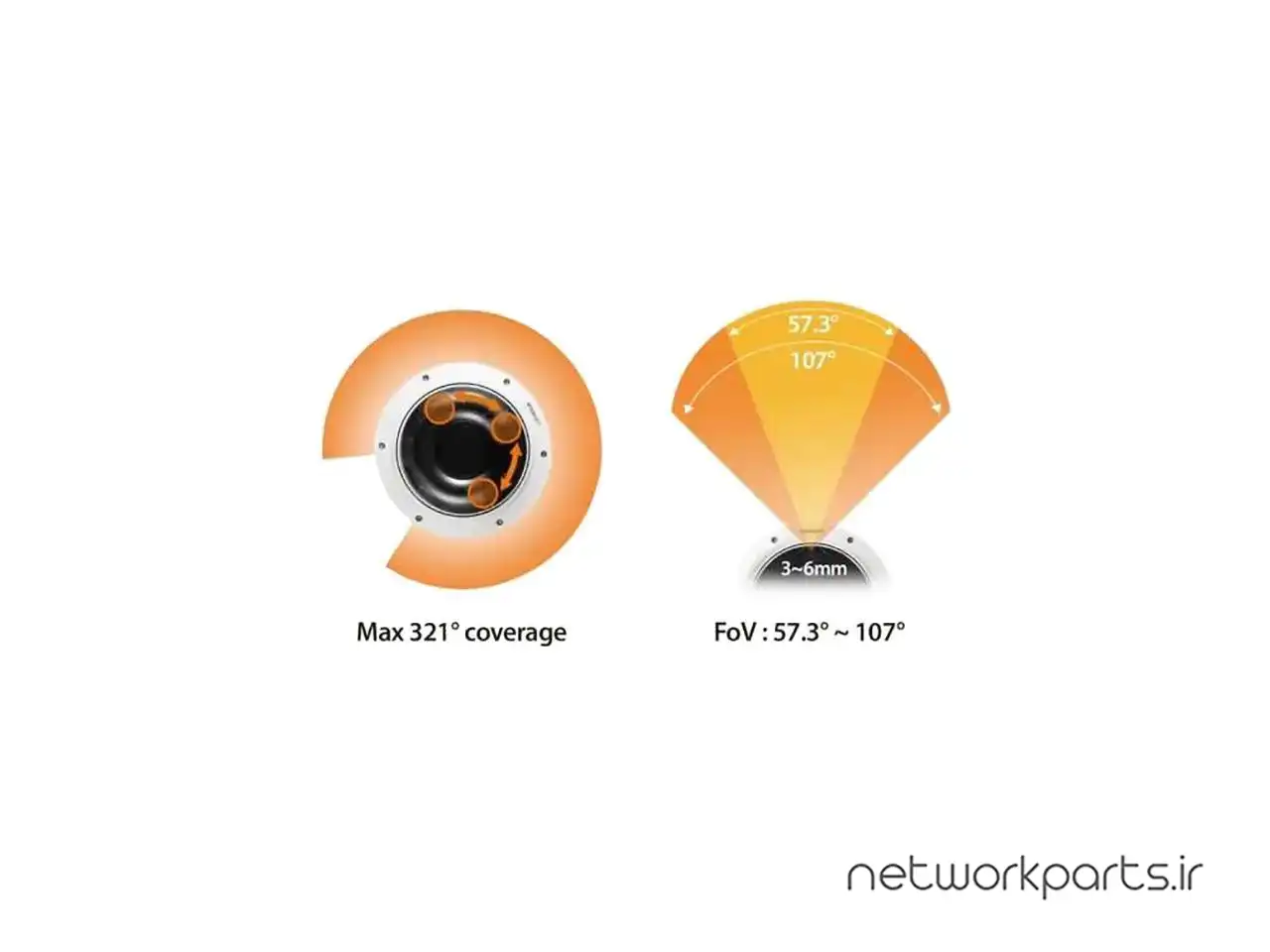 نوع لنز | Field of View: H: 107°(Wide)~56.3°(Tele) / V: 57°(Wide)~31.5°(Tele) / D: 126°(Wide)~64.3°(Tele), Lens Type: Varifocal |