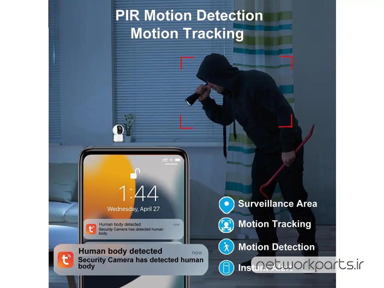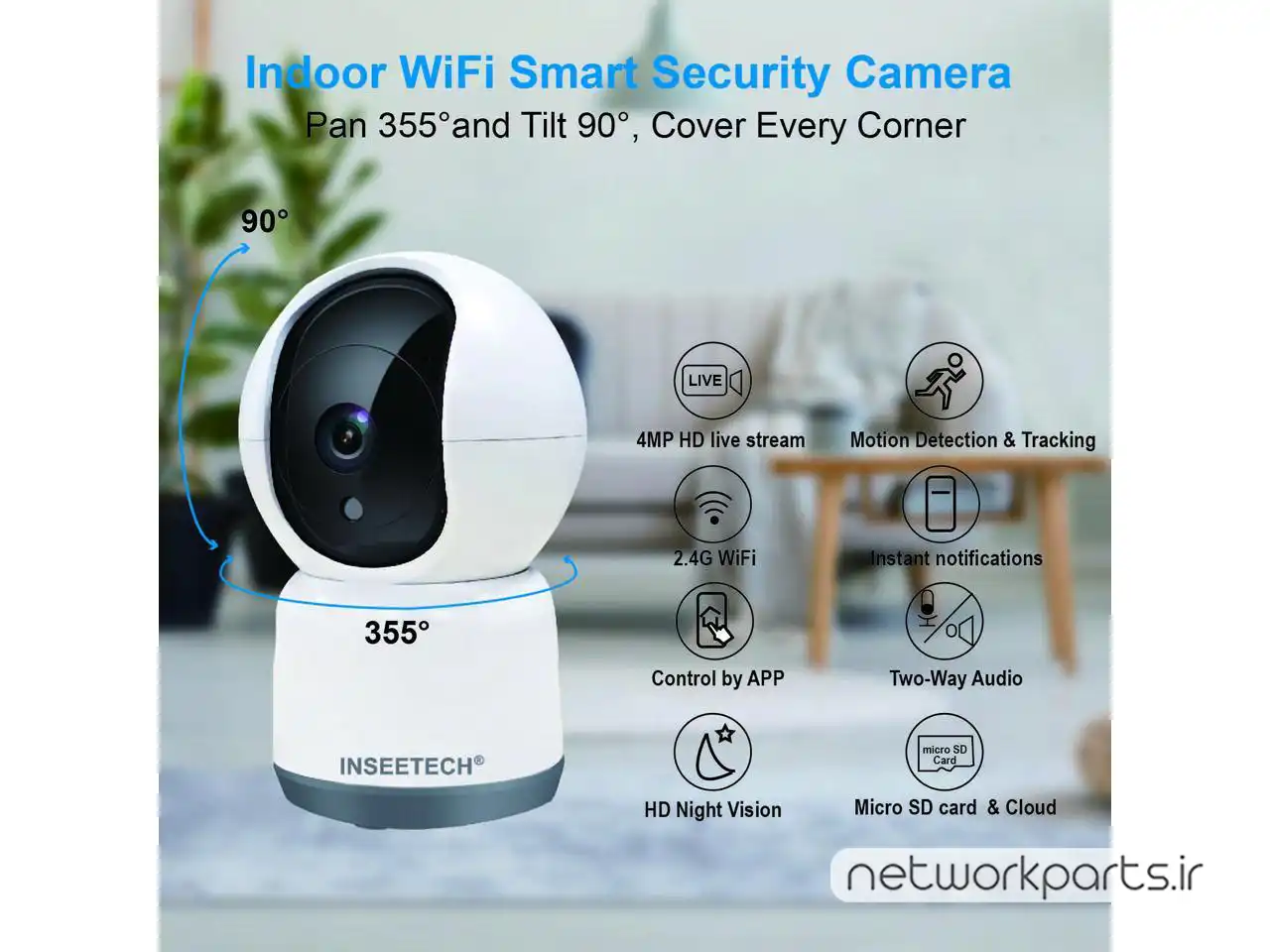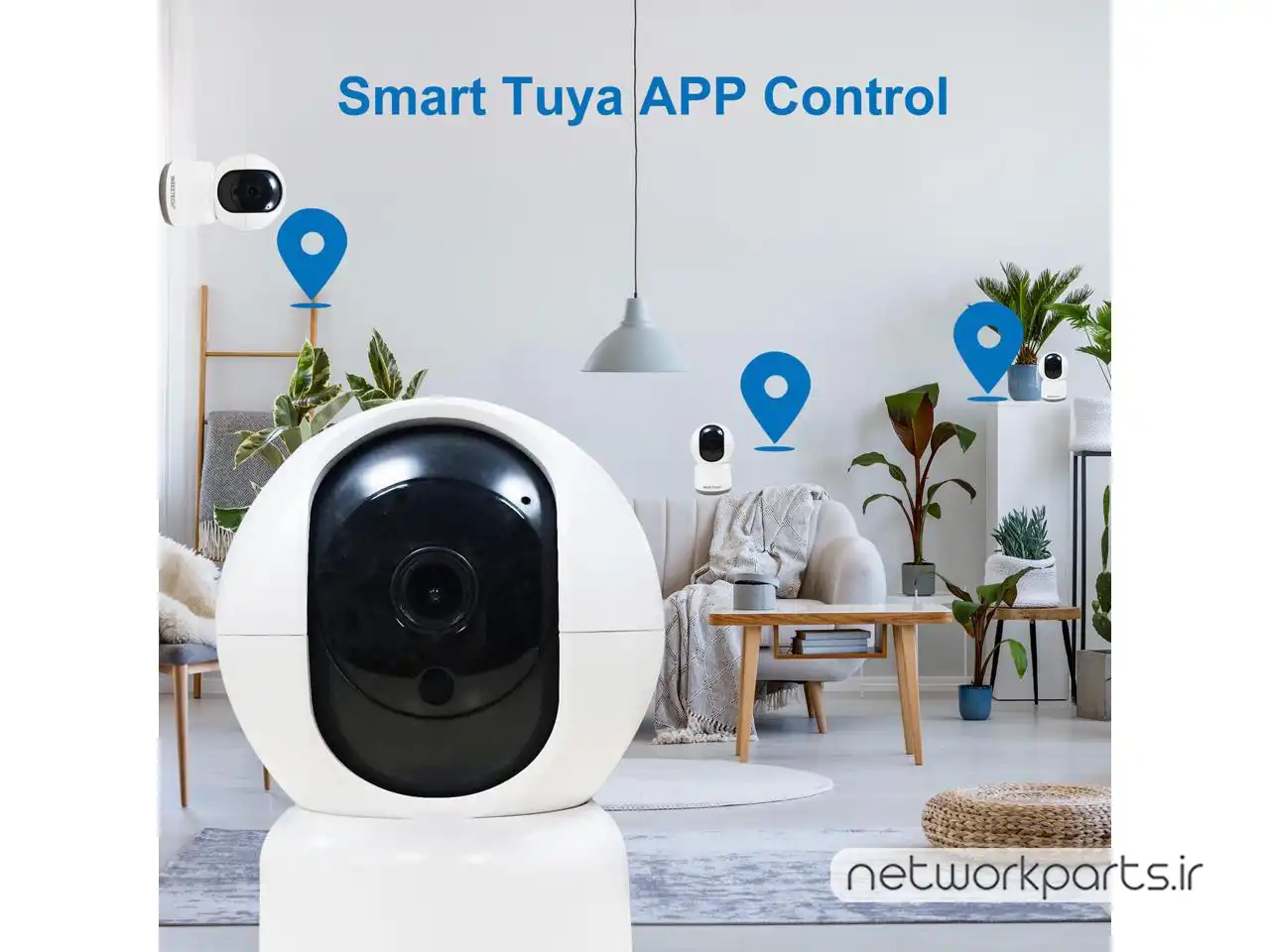 ویژگی ها | 4MP Super HD & 360°Full Coverage,, AI Human Detection & Motion Tracking,, Intelligent Control by Tuya APP,, Reliable Privacy Protection & Multiple Storage options, Super Night Vision & Two-way Talk, |