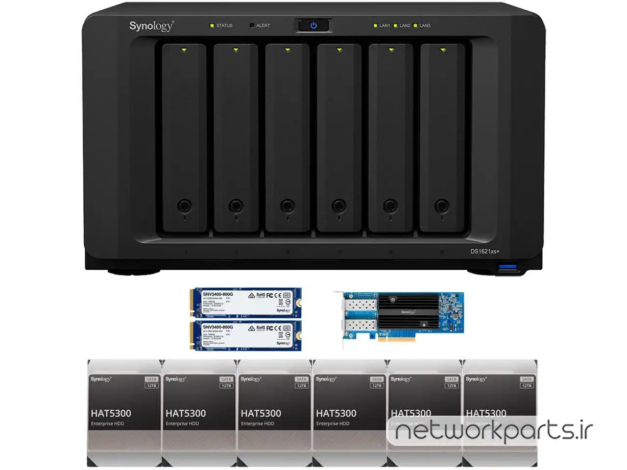محتویات بسته بندی | AC Power Cord, DS1621xs+ main unit, Installed 25GbE Card, Installed Cache, Installed Drives, Quick Installation Guide, RJ-45 LAN cable x 2 |