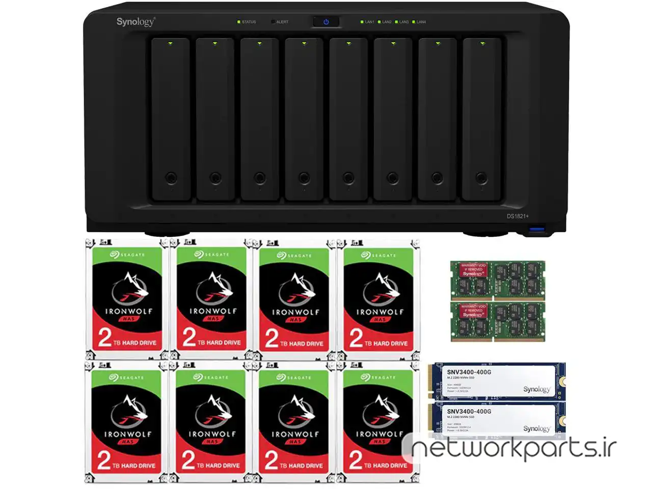 محتویات بسته بندی | Accessory packAC power cord, DS1821+ main unit, Installed Drives, Quick Installation Guide, RJ-45 LAN cable x 2 |