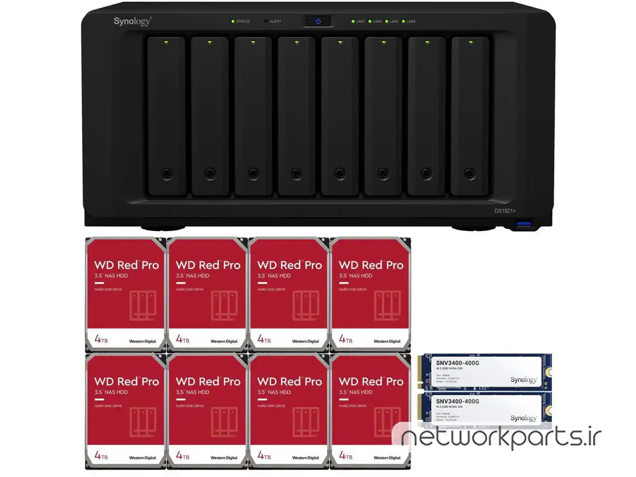 محتویات بسته بندی | Accessory packAC power cord, DS1821+ main unit, Installed Drives, Quick Installation Guide, RJ-45 LAN cable x 2 |