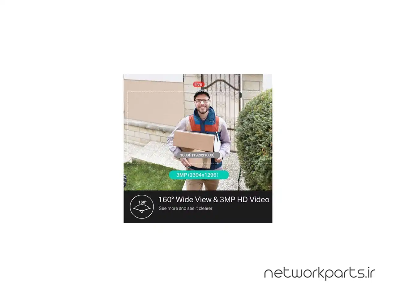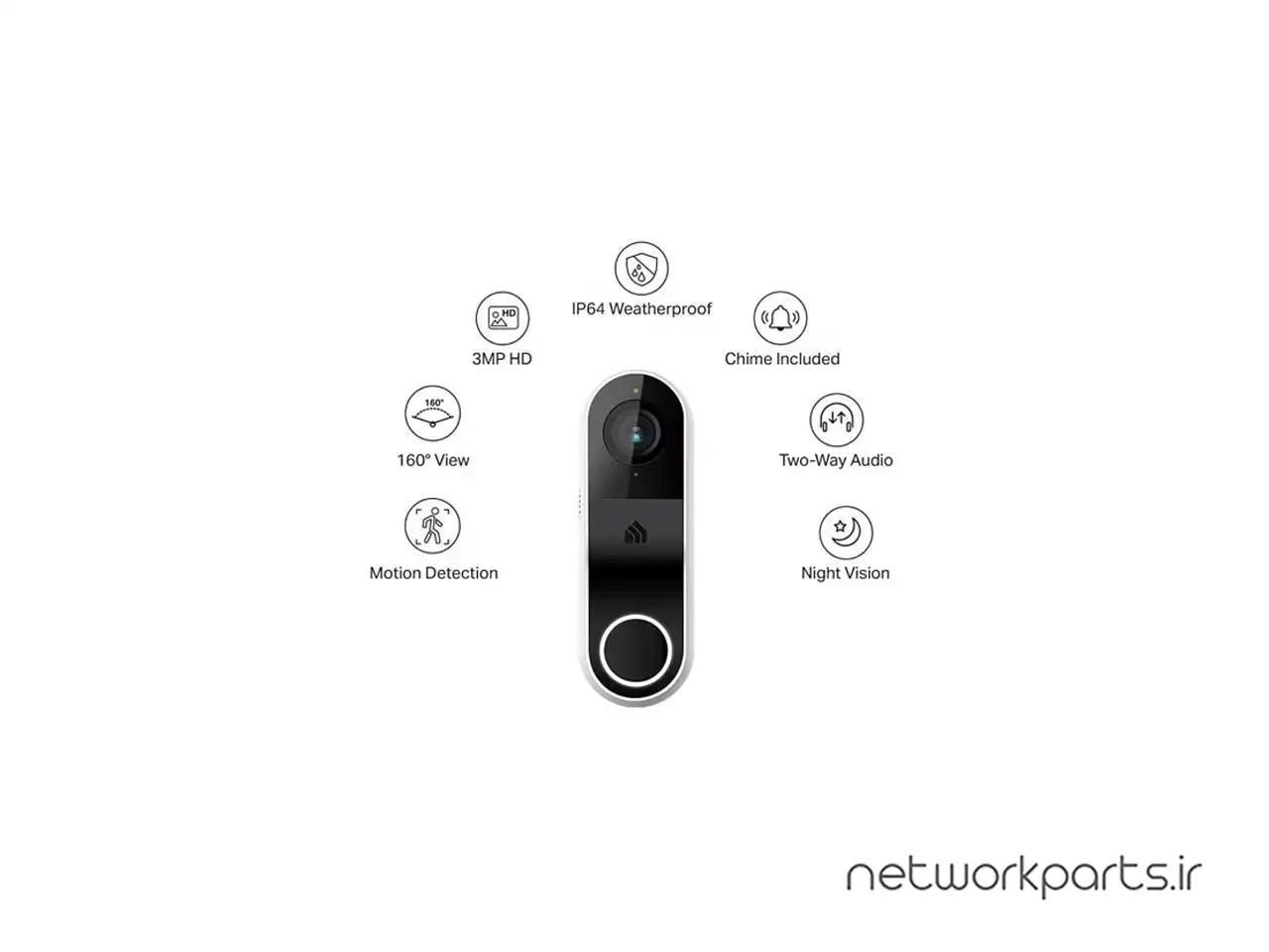 ویژگی ها | Audio, Audio Compression: G.711, Chime Audio Output: 8 Ringtones and Built-in speaker, Doorbell, Doorbell Audio Communication: 2-way audio, Doorbell Audio Input & Output: Built-in microphone and speaker, Environment:, Existing Doorbell Wires: Yes, Frame Rate: 15 fps, Frequency: 2.4 GHz, Image Sensor: 1/2.8", Lens: F/NO: 2.1; Focal Length: 2.1 mm, Network:, Night Vison: 850 nm IR LED up to 15 ft., Operating Humidity: 10% ~ 90% RH NC min, Operating Temperature: -20 ~ 40 degree Celsius (-4 ~ 104 degree Fahrenheit), Requirements:, Resolution: 3 MP HD (2304 x 1296 pixels), Security: 128 bit AES encryption with SSL/TLS, Storage Humidity: 5%~90%RH non-condensing, Storage Temperature: -20°C~70°C (-4°F~158°F), Storage: Supports Micro SD card, up to 128 GB (microSD card not included.), Transformer (not Included): 16V AC ~ 24V AC, 10 VA Minimum, 50/60Hz, Video, Video Compression: H.264, Video Streaming: 3 MP HD (2304 x 1296 pixels), Viewing Angle: Diagonal FOV = 160°, Wireless Rate: 11Mbps (802.11b) 54Mbps (802.11g) 72.2Mbps (802.11n), Wireless Security: WEP, WPA/WPA2-PSK |