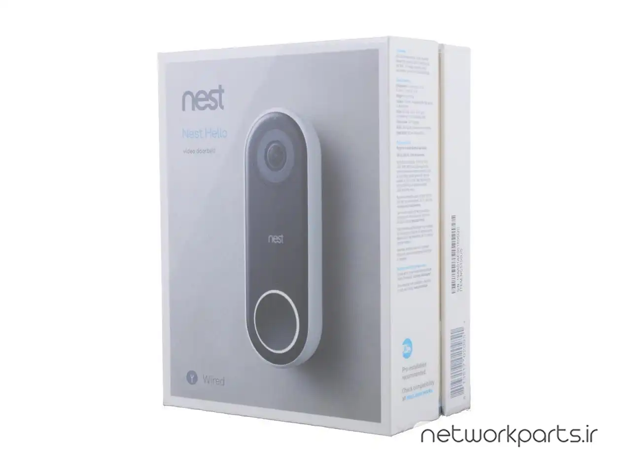 محتویات بسته بندی | 15 degree wedge, Chime connector, Extension wires, Masonry drill bit, Nest Hello video doorbell, Quick Start Guide, Release tool, Screws, Wall anchors, Wall Plate, Window decal |