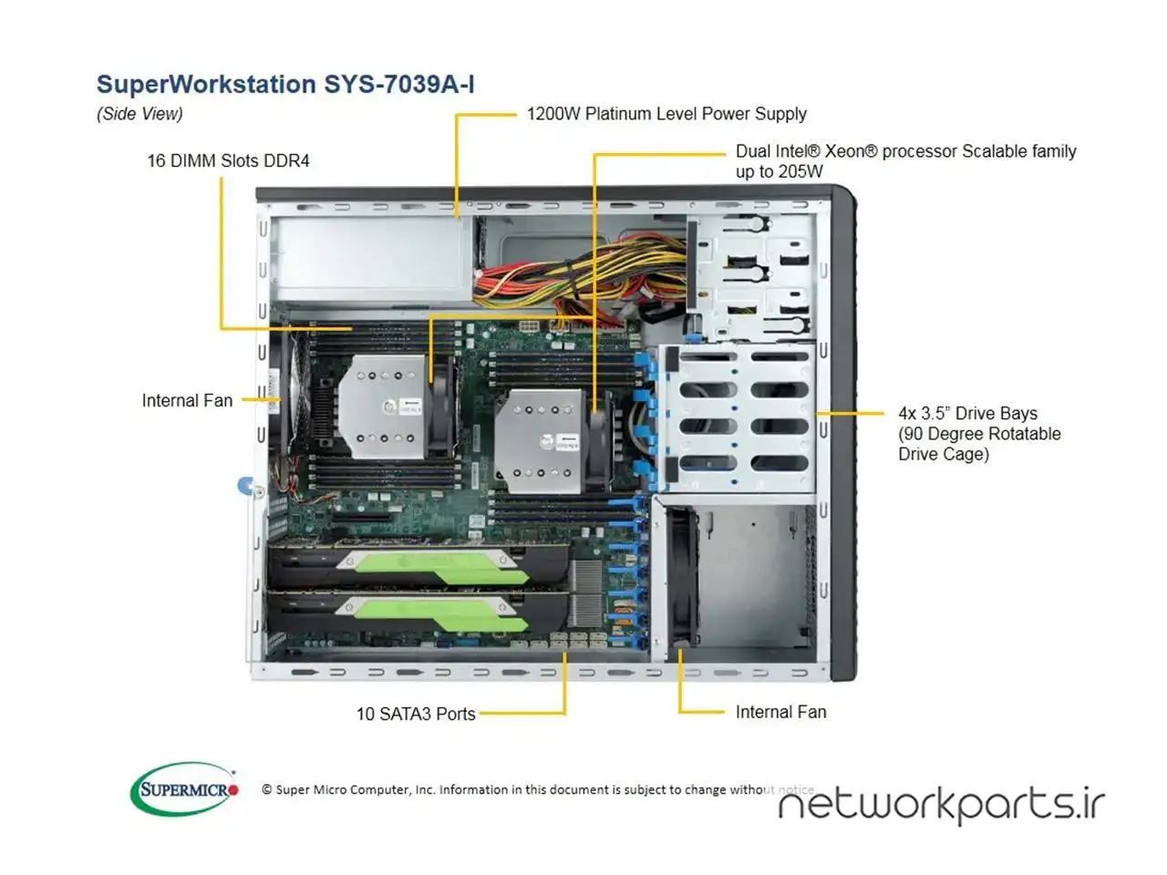 ویژگی ها | 1200W High-efficiency Power Supply Platinum Level Certified, 16x DIMMs; up to 4TB 3DS ECC DDR4-2933 MHz RDIMM / LRDIMM, Supports Intel Optane DCPMM, 1x M.2 slot, 2x NVMe support with optional cables, 2x 1 GbE LAN ports, 4x PCI-E 3.0 x16, 2 PCI-E 3.0 x8 slots, 7.1 HD Audio, Dual Socket P (LGA 3647) support 2nd Gen. Intel Xeon Scalable processors (Cascade Lake / Skylake), Internal fixed 3.5" drive bays, 2x 5.25" peripheral drive bays, M.2 Form Factor: 2260, 2280, 22110, M.2 Interface: PCI-E 3.0 x4, M.2 Key: M-Key, 2x PCI-E 3.0 NVMe x4 Internal Port (s) |