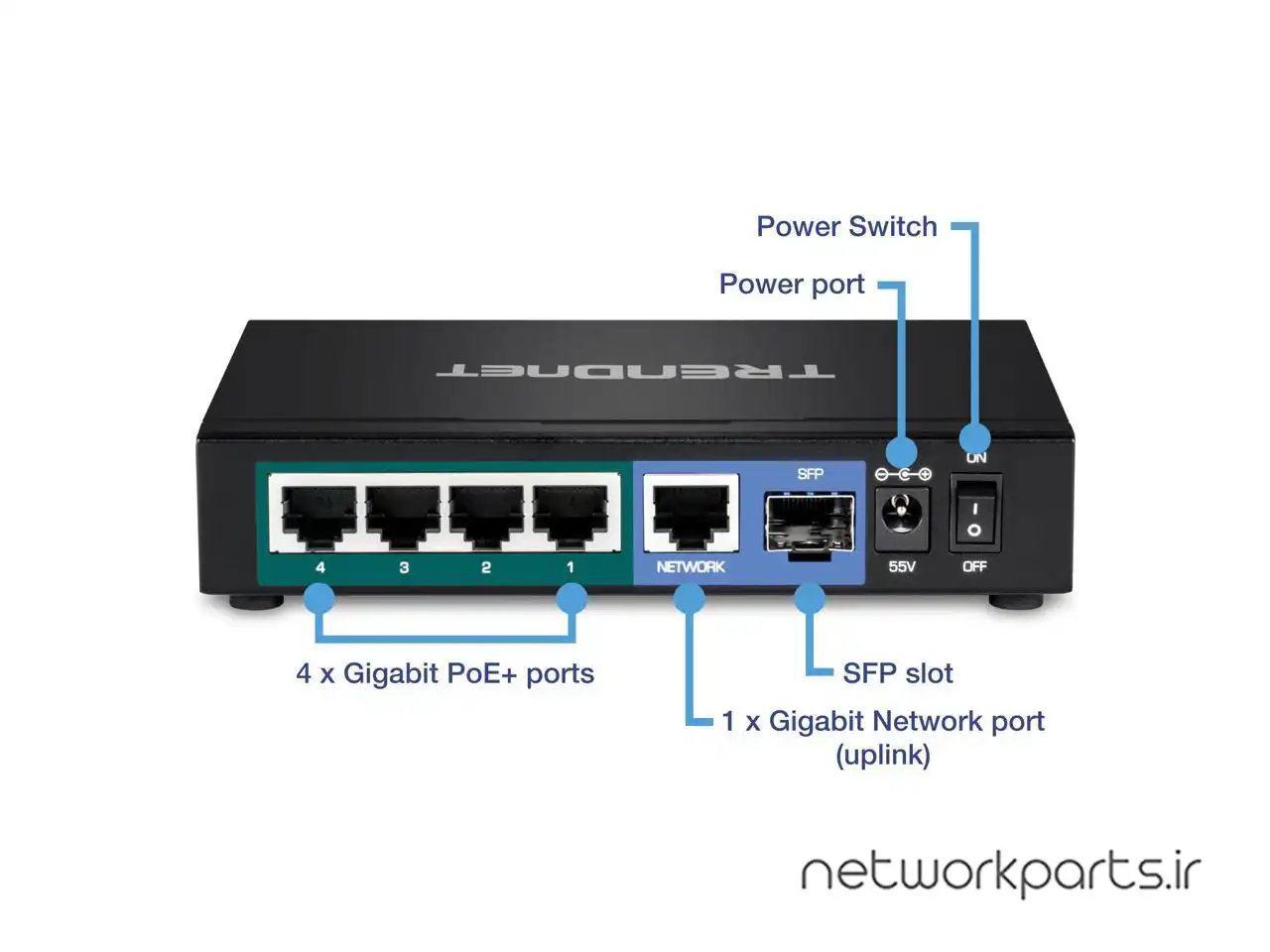 پورت های اصلی1x Gigabit Network port (uplink), 1x SFP slot, 4x Gigabit PoE+ ports (ports 1-4)