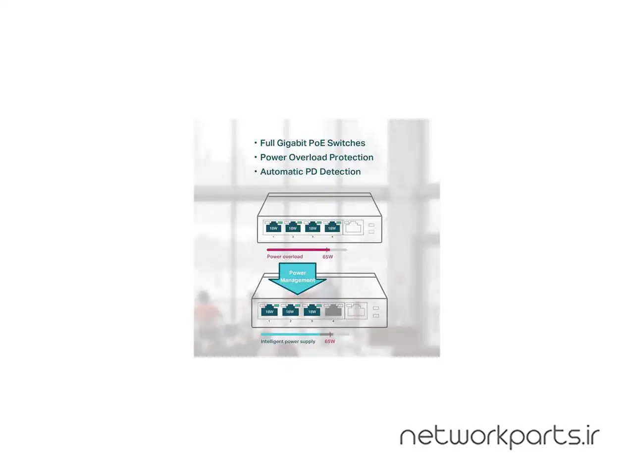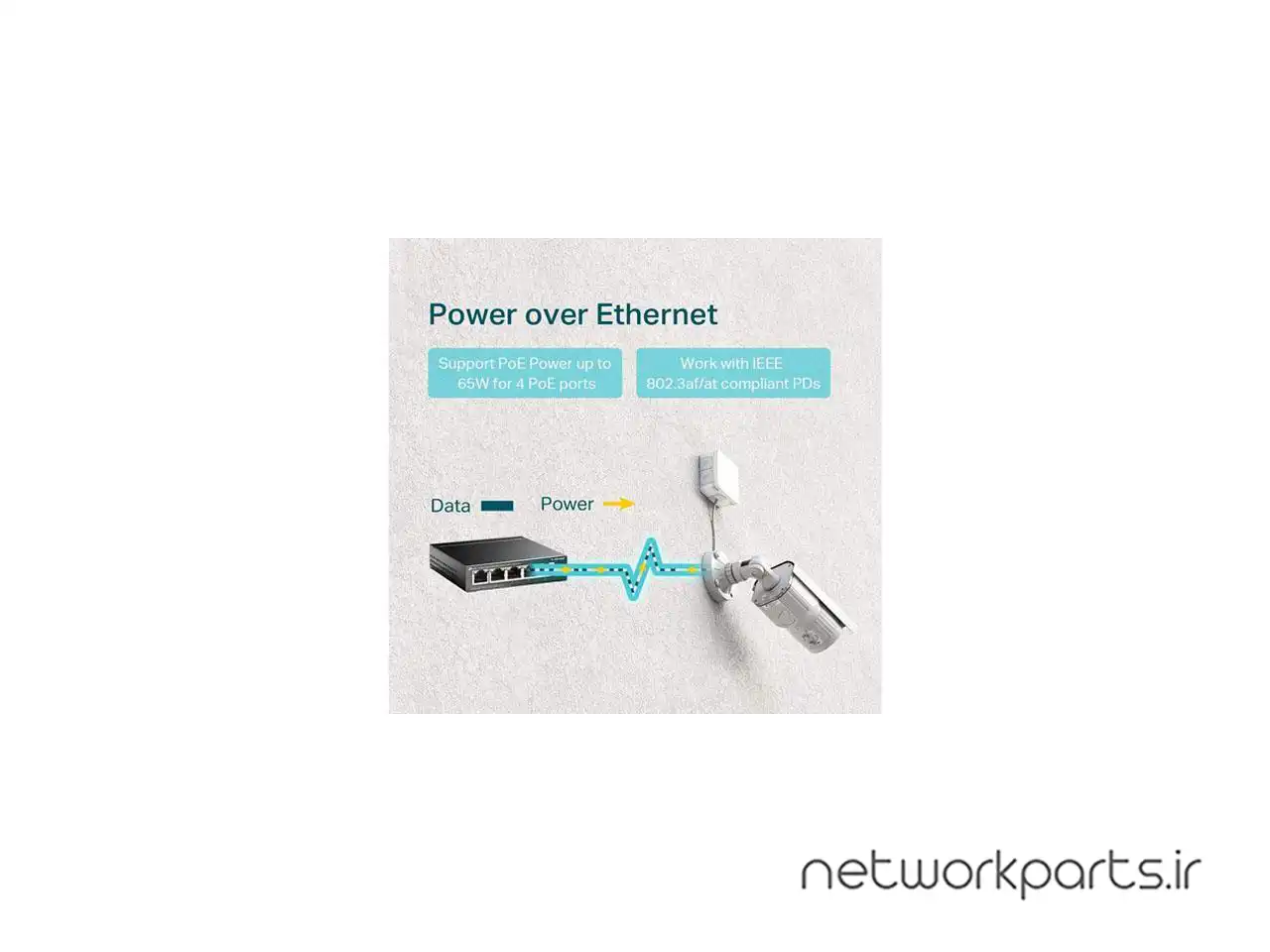 ویژگی ها | 5 x 10/100/1000 Mbps RJ45 ports, 802.1p / DSCP QoS enable smooth latency-sensitive traffic, Requires no configuration and installation, Supports PoE power up to 36 watts for each PoE port, With four PoE ports, transfers data and power on one single cable, Working with IEEE 802.3af compliant PDs, expands home and office network |