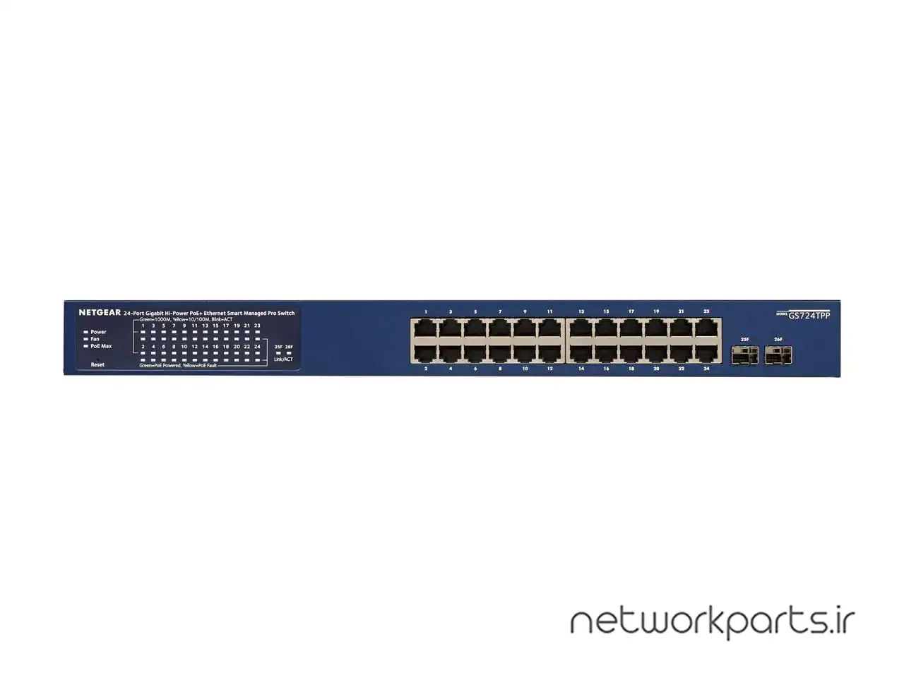 ویژگی ها | Advanced features such as IPv6 management, ACL, DiffServ QoS, LACP link aggregation and Spanning Tree will satisfy even the most advanced small business networks., The NETGEAR GS724TPP 24-Port Gigabit Ethernet Smart Managed Pro PoE+ Switch comes with 24 PoE+ copper ports and 2 dedicated SFP ports for uplinks. Organizations can now deploy PoE devices with a high |