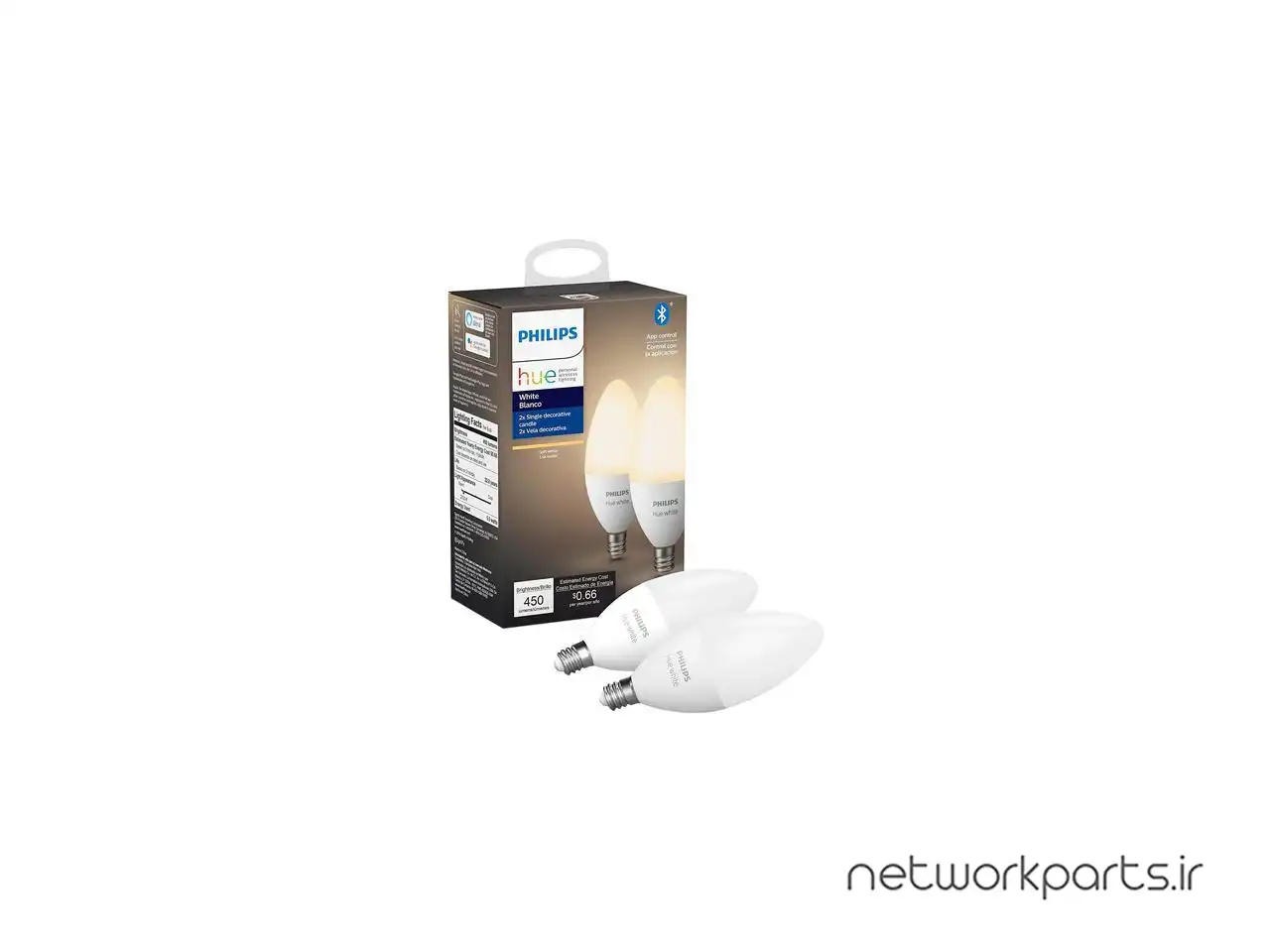 ویژگی ها | - Dimmable via smart device only, - Soft white light, 2700K, Communication protocol: Bluetooth and Zigbee, Deep dimmable: No, Environmental, Fitting: E12, Form factor: Candle, Input voltage: 110V-130V, Light output:, Lumen output: 450 lm, Max. operation power: 5.5 W, Max. standby power: 0.5 W, Number of switching cycles: 50,000, Operational humidity: 5% <H<95% (non condensing), Operational temperature: -20°C to 45°C, Rated lifetime: 25,000 hour(s), Software upgradable: when connected to Bluetooth App or Hue Bridge, Software upgradable: Yes, Start up: Instant 100% light output, The bulb: |