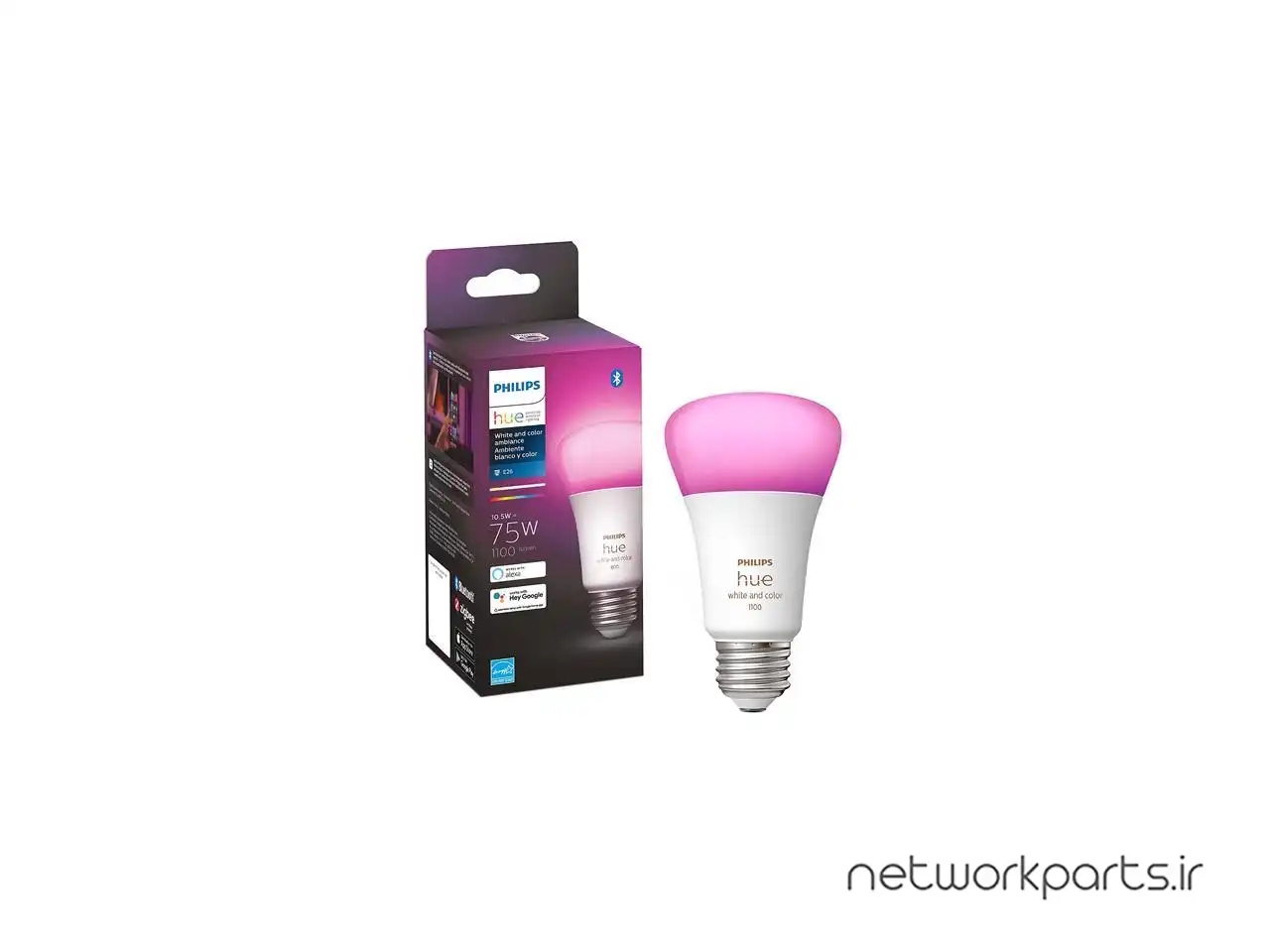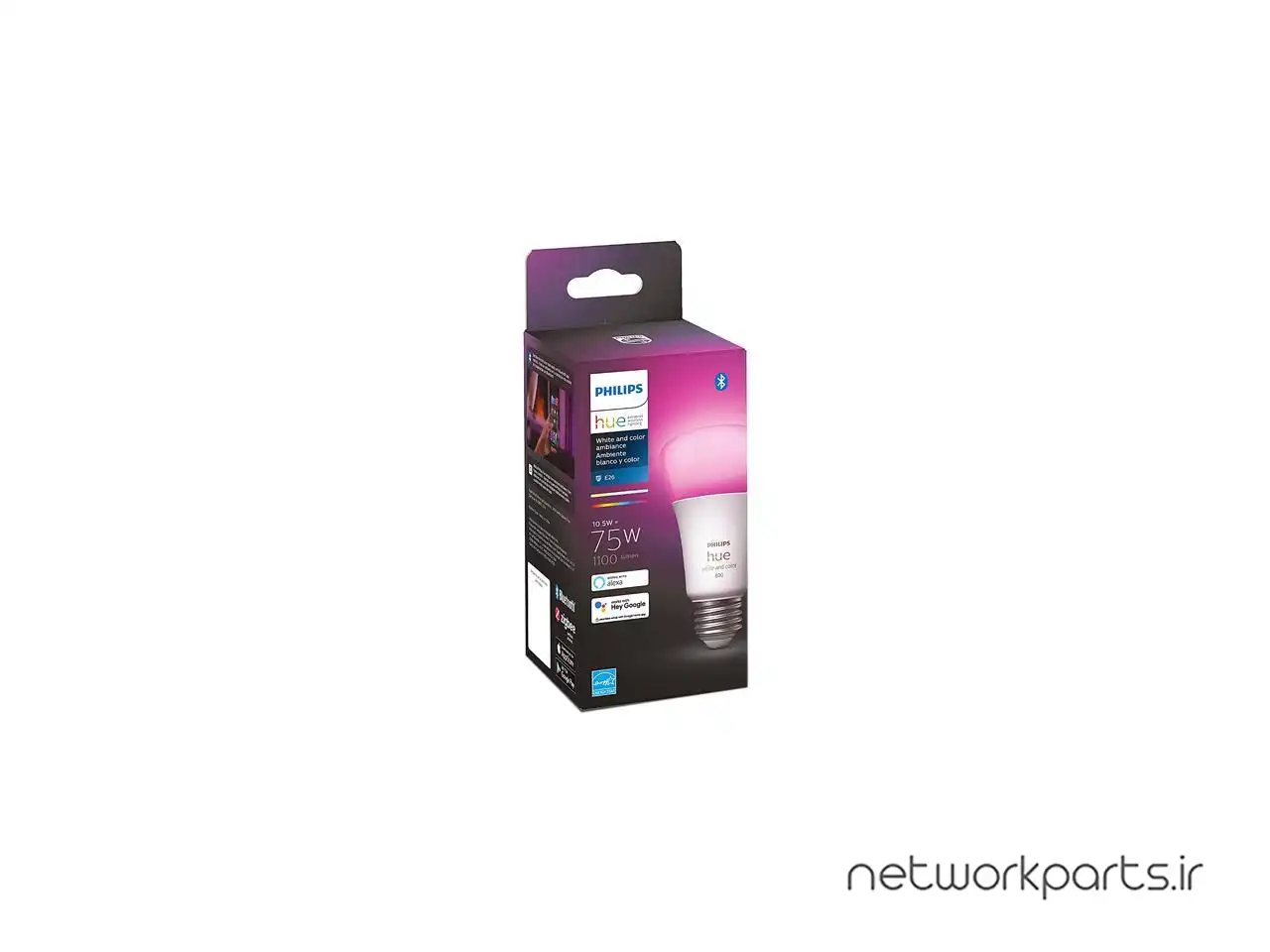 ویژگی ها | Bulb dimensions: 62x112mm, Bulb technology: LED, Color temperature: 2000-6500 K, Communication protocol: Bluetooth and Zigbee, Diameter: 62 mm, Dimmable with Hue app and switch: Yes, Energy label (acc (EU) 874/2012; A++ - E): Not applicable, Environmental, Extra feature/accessory incl., Fitting: E26, Form factor: A19, Height: 112 mm, HomeKit compatible: Yes, Input voltage: 110V-130V, IOS: Yes, Lifetime: 25000 Hours, Light output: 16 million colors, Lumen output at 2700K (out-of-the-box setting): 800 lumen, Lumen output at 4000K: 1,100 lumen, Lumen output: 1100 lm @ 4000K, Max. operation power: 10.5 W, Max. standby power: 0.2 W, Number of switching cycles: 50,000, Operational humidity: 5% <H<95% (non condensing), Operational temperature: -20°C to 45°C, Philips Hue App: IOS 13 and aboveAndroid 8.0 and above, Philips Hue Bluetooth App: Android 7.0 and laterIOS 11 and later, Power Factor: >0.5, Rated lifetime: 25,000 hour(s), Software upgradable: when connected to Bluetooth App or Hue Bridge, Software upgradable: Yes, Start up: Instant 100% light output, Technical specifications, The bulb:, Voice assistants: Amazon AlexaApple HomeKit (Via Hue Bridge)Google AssistantMicrosoft Cortana (Via Hue Bridge), Wattage equivalent: 75 W, Wattage: 10.5 W, Weight: 70g, What's supported: |