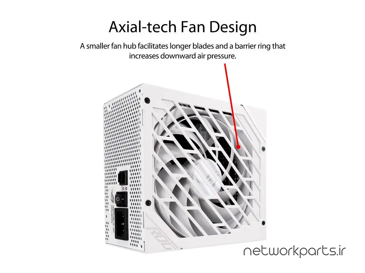 ویژگی ها | 0dB technology lets you enjoy light gaming in relative silence., 10-year warranty included., An 80 Plus Gold Certification is the result of Japanese capacitors and other premium components., Axial-tech fan design features a smaller fan hub that facilitates longer blades and a barrier ring that increases downward air pressure., Cosmetic customization is enabled by a magnetic logo and stickers that help you reskin the visible side to your liking., Dual Ball Fan Bearings can last up to twice as long as sleeve bearing designs., Fully modular cables keep your rig neat and tidy., ROG heatsinks cover critical components. Lower temps result in a longer lifespan and reduced noise. |
