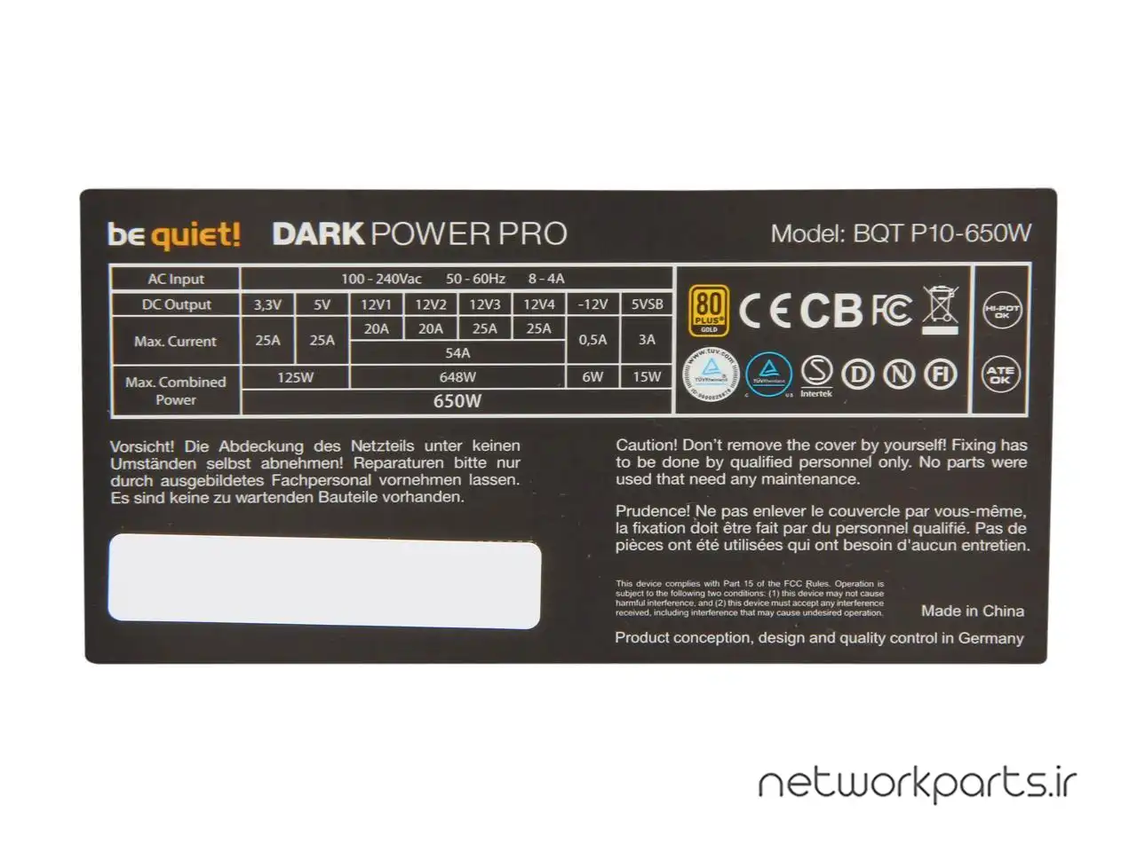 ویژگی ها | 650 Watts of continuous power provide deep power reserves for demanding computing applications, 80Plus Gold certification with higher efficiency 87%~90% at 20%~100% loading, Cable management with extra long cable reach simplifies component installation and reduces annoying clutter, increasing airflow and improving cooling in even the largest PC cases, German product conception, design and quality control, NVidia SLI and AMD CrossfireX multi-GPU certifications allow you to buildMulti-GPU systems with utter confidence, Overclocking key allows switchover between quadruple independent +12V rail mode and high-performance single-rail operation, SilentWings fan features airflow-optimized fan blades, fluid dynamic bearing with copper core and high quality IC motor controller for the quietest possible operation, Virtually silent operation achieved through a broad array of meticulous optimizations, including use of be quiet!'s custom-designed 135mm SilentWings fan |