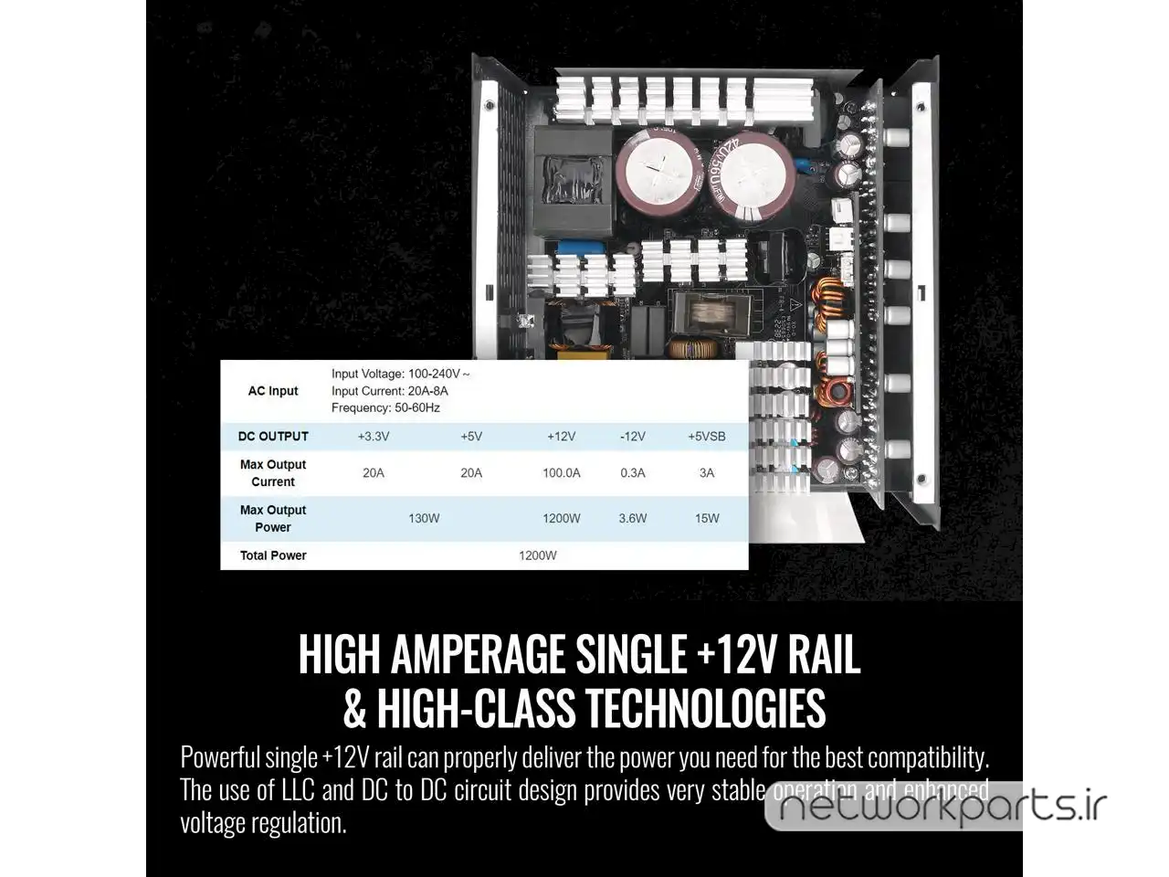 ویژگی ها<30mV Low Ripple Noise, 100% high quality Japanese 105°C/221°F capacitor, Compatible with Intel ATX 3.0 specification, providing sufficient and stable power delivery, Fully modular with black low-profile flat cables, High amperage single +12V rail design, PCIe Gen 5 ready, designed with native PCIe 12+4pin modular interface., PCIe Gen.5 600W 12VHPWR cable included, Smart Zero Fan: auto-regulated fan speed based on power consumption for a quiet and efficient operation, Ultra-quiet 120mm fluid dynamic bearing fan