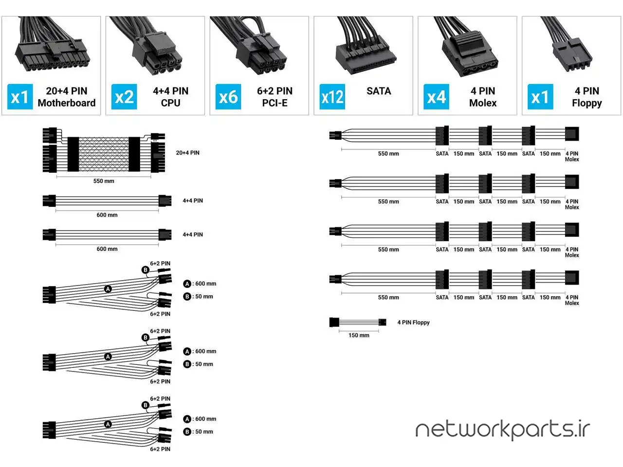 | ویژگی های کابل | 4+4Pin CPU: Two cables (750mm) |