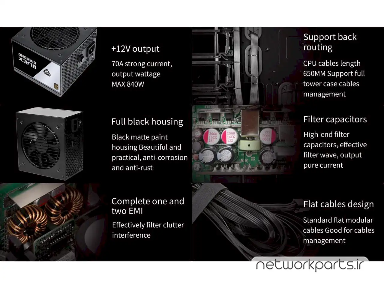 ویژگی ها1.80+ Gold certified, deliver up to 92% efficiency and reduce operating cost.DC to DC Circuit Design, Runs cooler and uses less power than less efficient power supplies., 2.Full modular cable design allow you to remove unneeded cables for maximum airflow., 3.Resonant LLC topology with DC-to-DC conversion provides clean, consistent power, reduces coil whine for quieter operation, 4.100% Industrial-grade, 105°C rated Japanese capacitors ensure unwavering power and reliability., 5.Supports Modern Standby sleep mode for extremely fast wake-from-sleep times and better low-load efficiency., 6.Full Voltage Power Supply 100 - 240 V 47 - 63 Hz.FDB Fan for ultra-quiet operation and increased lifespan.