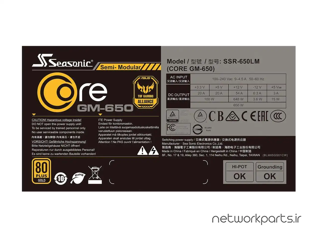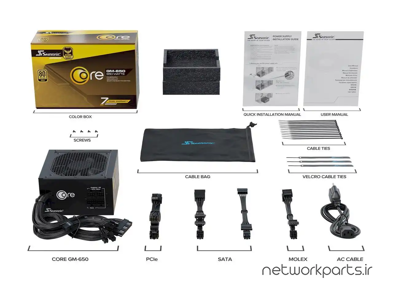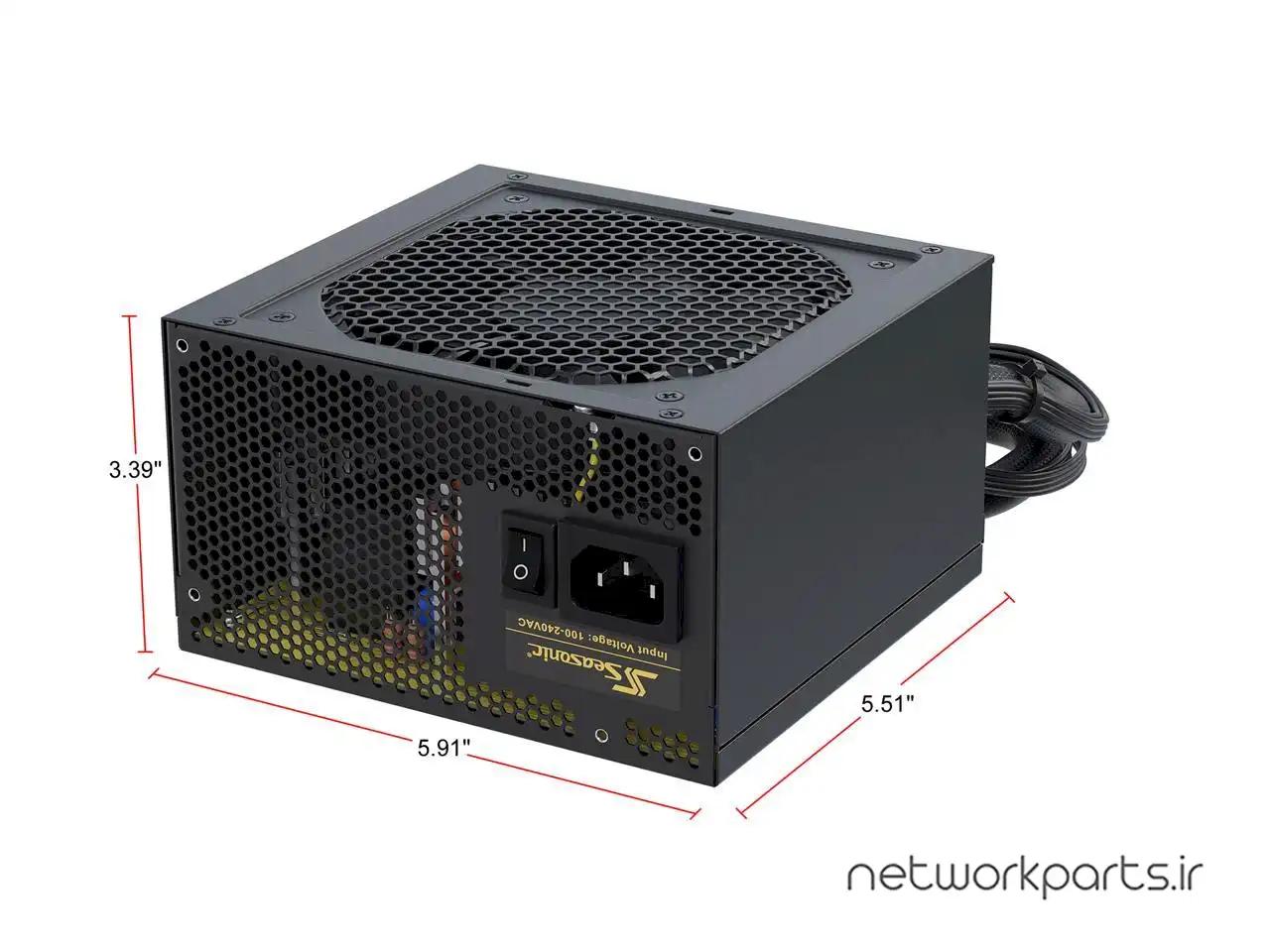 ویژگی ها | Compact Size (140 mm), DC to DC converter design, High Efficiency, 80 PLUS Gold Certified, Highly Reliable Japanese 105 °C Aluminum Electrolytic Capacitors, Seasonic Smart and Silent Fan Control (S2FC), Semi-Modular Cabling Design, Tight Voltage Regulation |