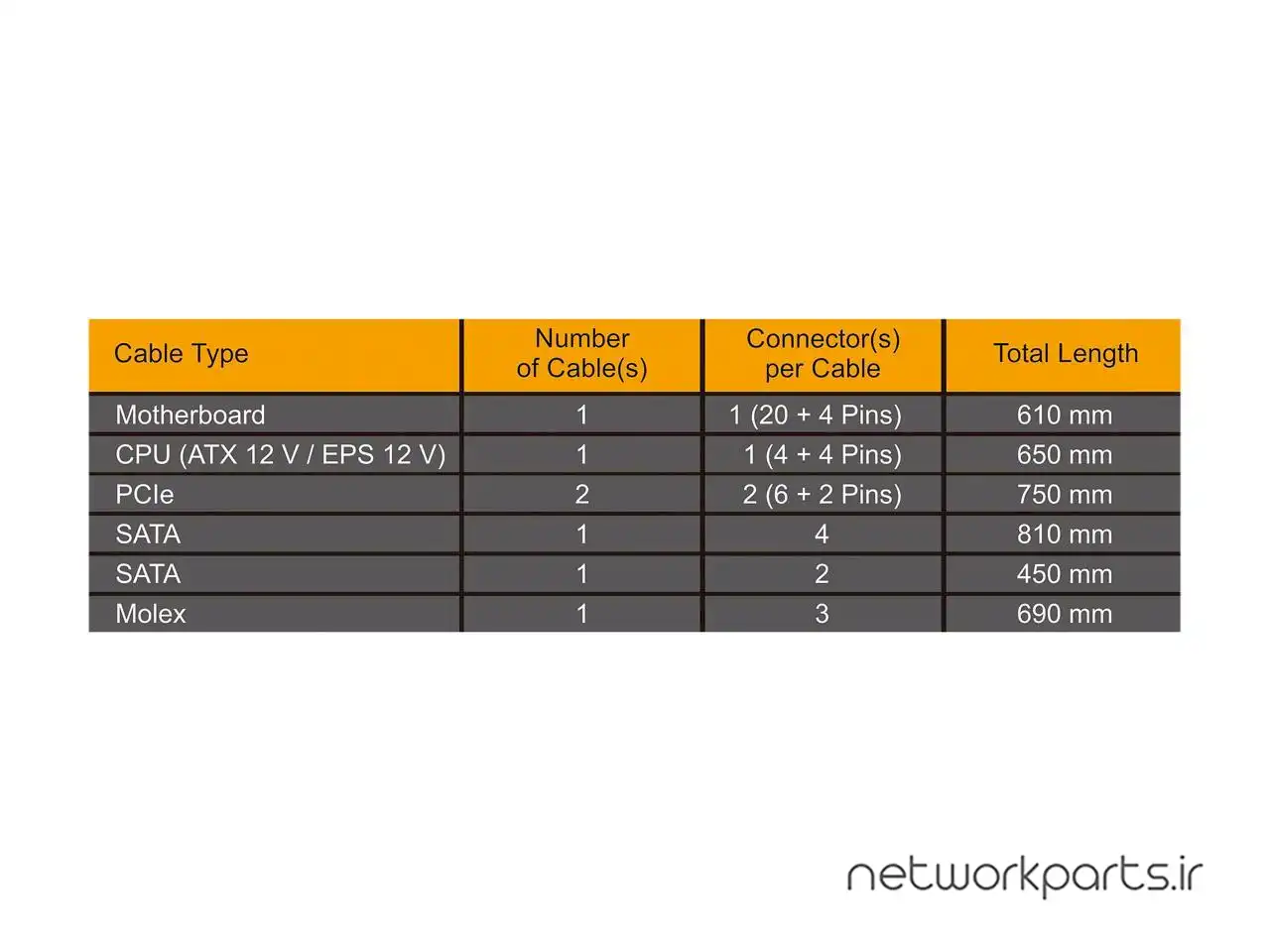 اتصالات | 1 x EPS 12V / ATX 12V (8P / 4P), 1 x Main Power (24P / 20P), 3 x Molex, 4 x PCI-E (8P / 6P), 6 x SATA |