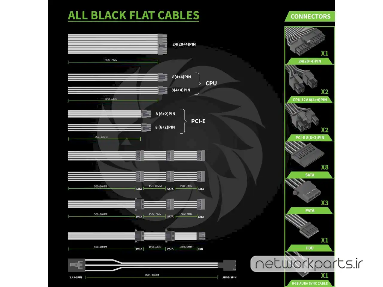 ویژگی های کابل | 4+4Pin CPU: Two cables (750mm), PCI-E 6+2Pin: Two cables (500mm) |