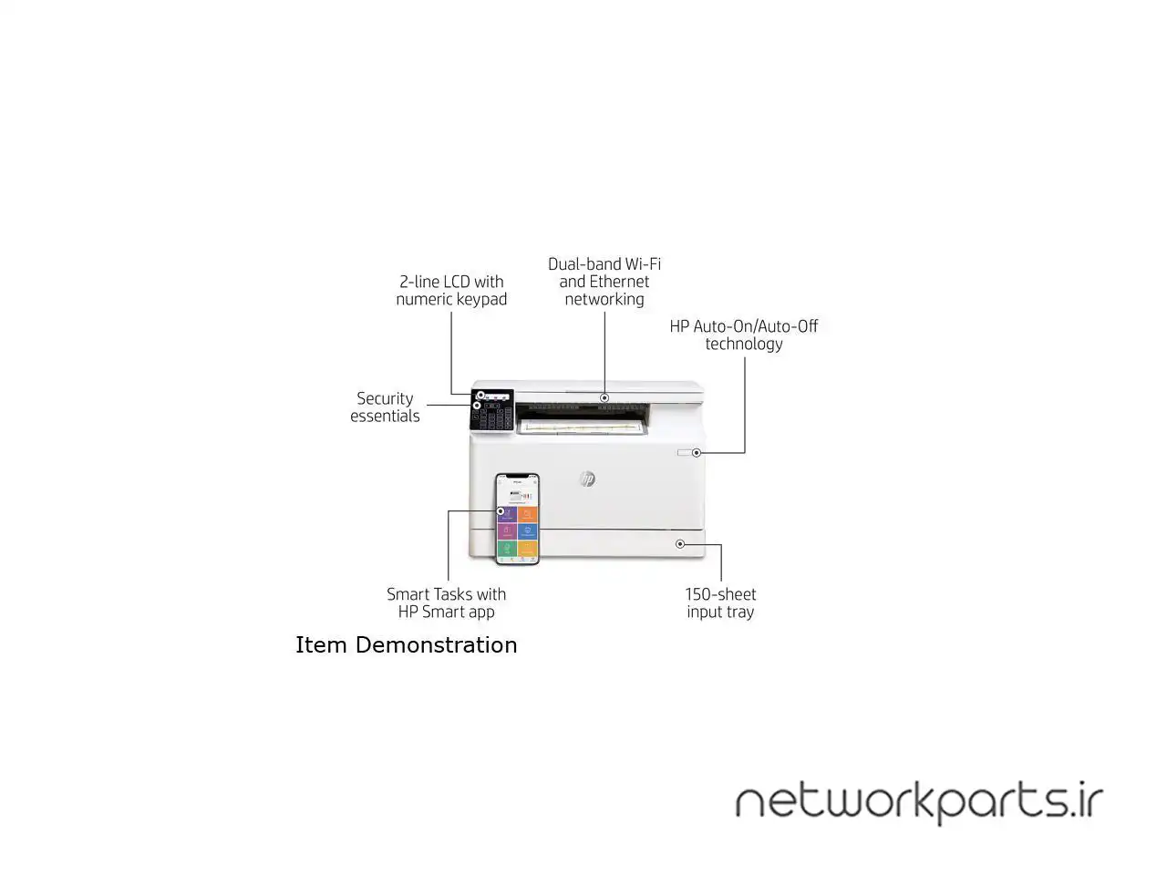 ویژگی ها | Copy Resolution: Black (text & graphics): Up to 600x 600 dpi; Color (text & graphics): Up to 600x 600 dpi, Display: 2-Line LCD, Duty cycle: Monthly (letter): Up to 30,000 pages, Mobile Printing Capability: Apple AirPrint; Google Cloud Print 2.0; Mopria-certified; Wi-Fi Direct, HP Smart App, Paper Handling: 150-sheet input tray; 100-sheet output bin, Print Resolution: Black (best): Up to 600x 600 dpi; Color (best): Up to 600x 600 dpi, Print Speed: Up to 17 ppm black; Up to 17 ppm Color; First Page Out: As fast as 11.6 sec black, Scan Resolution: Hardware: Up to 1200x 1200 dpi; Optical: Up to 1200 dpi, Standard Connectivity: Hi-Speed USB 2.0 port; built-in Fast Ethernet 10/100 Base-TX network port, 802.11n 2.4/5GHz wireless |