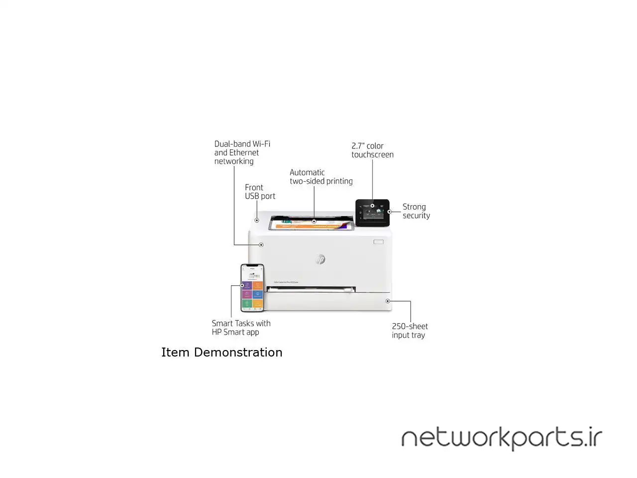 ویژگی ها | Display: 2.7" color graphic screen, Duty cycle: Monthly (letter): Up to 30,000 pages, Mobile Printing Capability: Apple AirPrint; Google Cloud Print 2.0; Mopria-certified; Wi-Fi Direct, HP Smart App, Paper Handling: 250-sheet input tray; 100-sheet output bin, Print Resolution: Black (best): Up to 600x 600 dpi; Color (best): Up to 600x 600 dpi, Print Speed: Letter: Up to 22 ppm black; Up to 22 ppm Color; First Page Out: As fast as 10.20 sec black, Standard Connectivity: Hi-Speed USB 2.0 port; built-in Fast Ethernet 10/100 Base-TX network port, 802.11n 2.4/5GHz wireless |