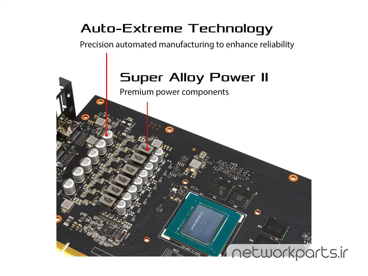 | ویژگی ها | 0dB technology lets you enjoy light gaming in relative silence., Aura Sync compatibility lets you customize and sync lighting effects with other compatible hardware., Auto-Extreme Technology uses automation to enhance reliability., axial-tech-fan-design-f, Concurrent Floating Point and Integer Processing: Turing GPUs more efficiently process the compute heavy workloads of modern games., MaxContact Technology allows 2X more contact with the GPU chip for improved thermal transfer., OC Edition: Boost Clock 1860 MHz (OC Mode) / 1830 MHz (Gaming Mode)., RT Cores: Dedicated ray tracing hardware enables fast real-time ray tracing of objects and environments with physically accurate shadows, reflections, refractions, and global illumination., Super Alloy Power II includes premium alloy chokes, solid polymer capacitors, and an array of high-current power stages., Ultra-fast GDDR6: Experience up to 496 GB/s of memory bandwidth for high-speed, high-resolution gaming. |
