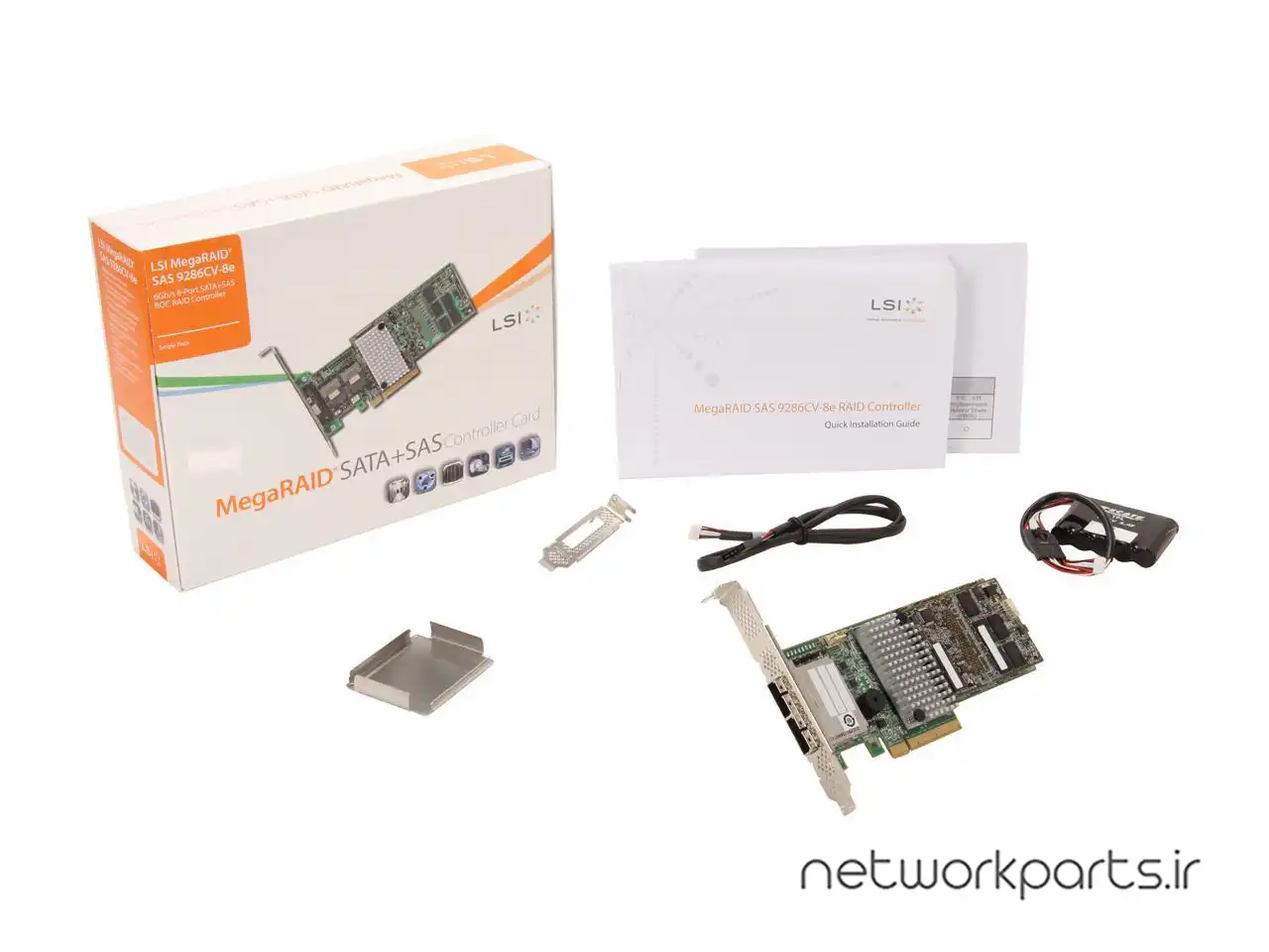 محتویات بسته بندی | LP bracket, MR SAS 9286CV-8e (includes RAID controller, CacheVault flash module, CacheVault power module, CacheVault clip and remote cable), QIG |